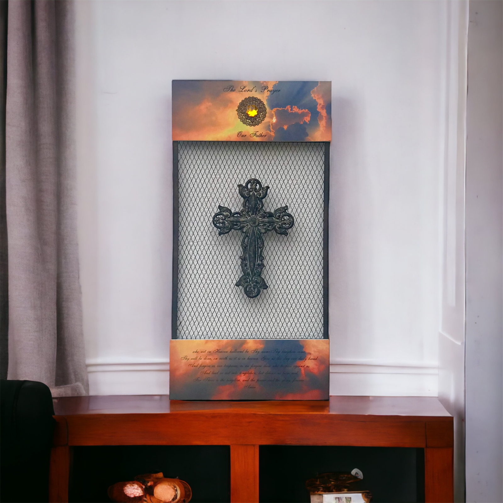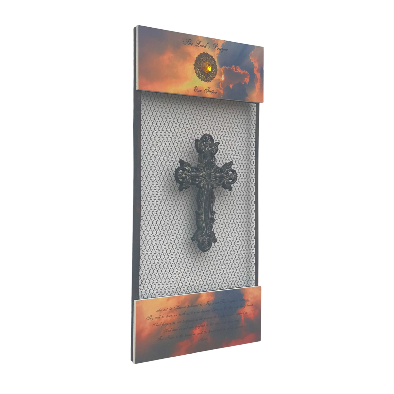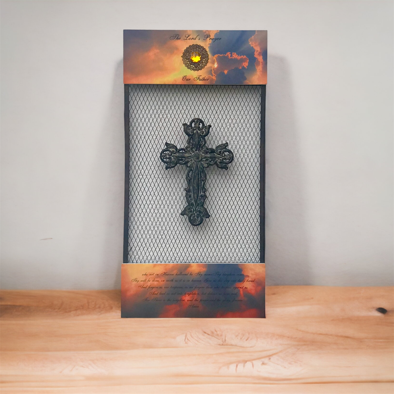 The LordsPrayer Resin Cross on Wood and Metal Mesh