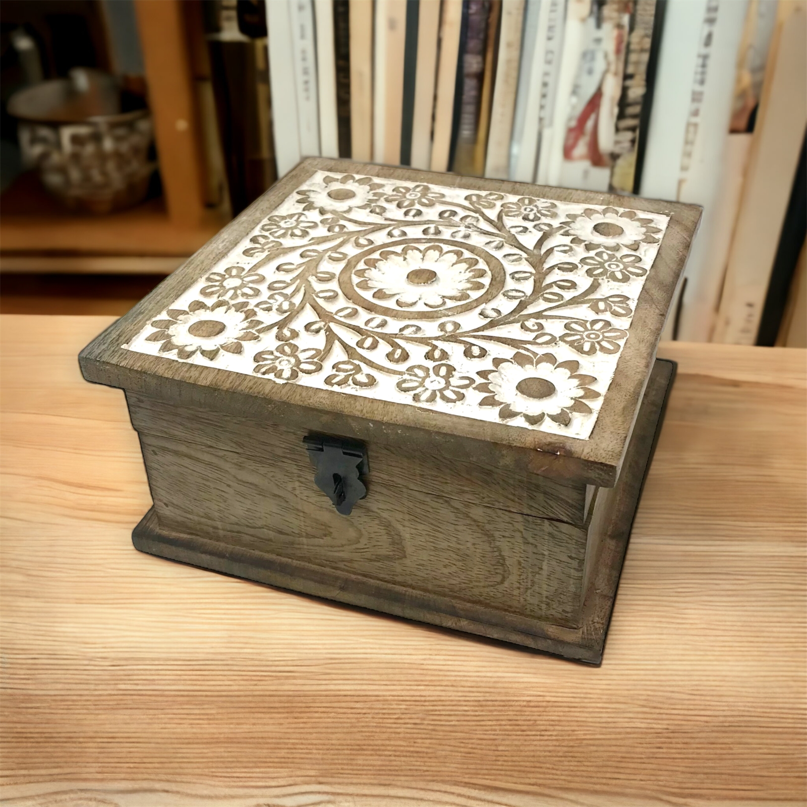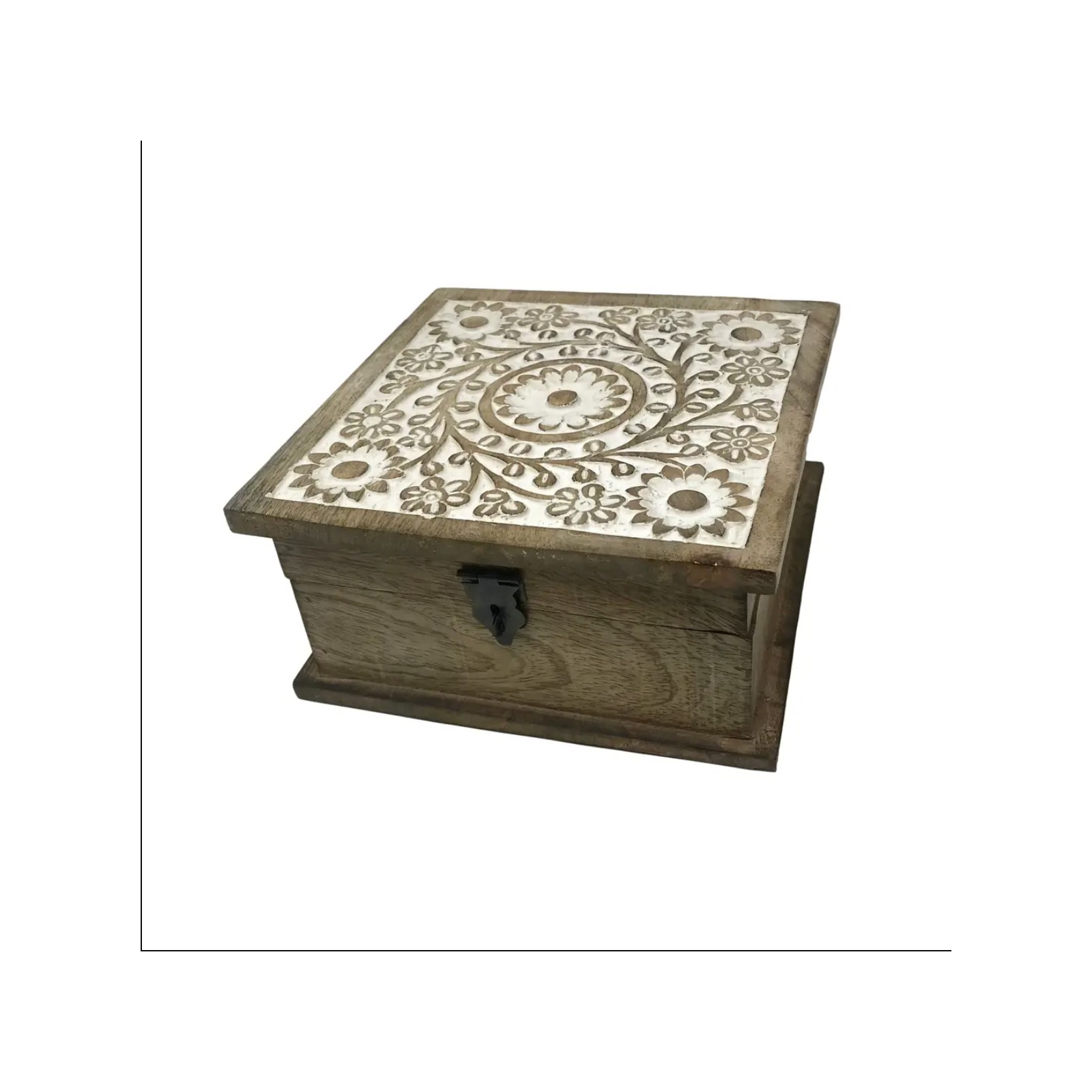 We are excited to introduce our Hand-Carved Wood Flower Garden Hinged Square Table Box made in India. This beautiful box is a perfect addition to any home decor and is sure to add a touch of elegance and sophistication to your inventory.