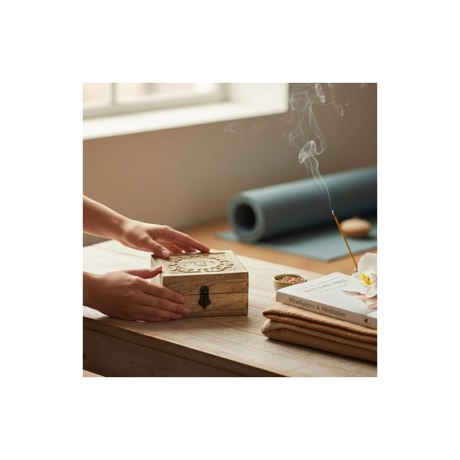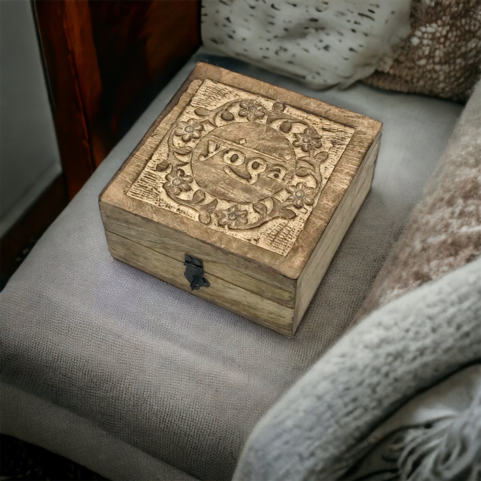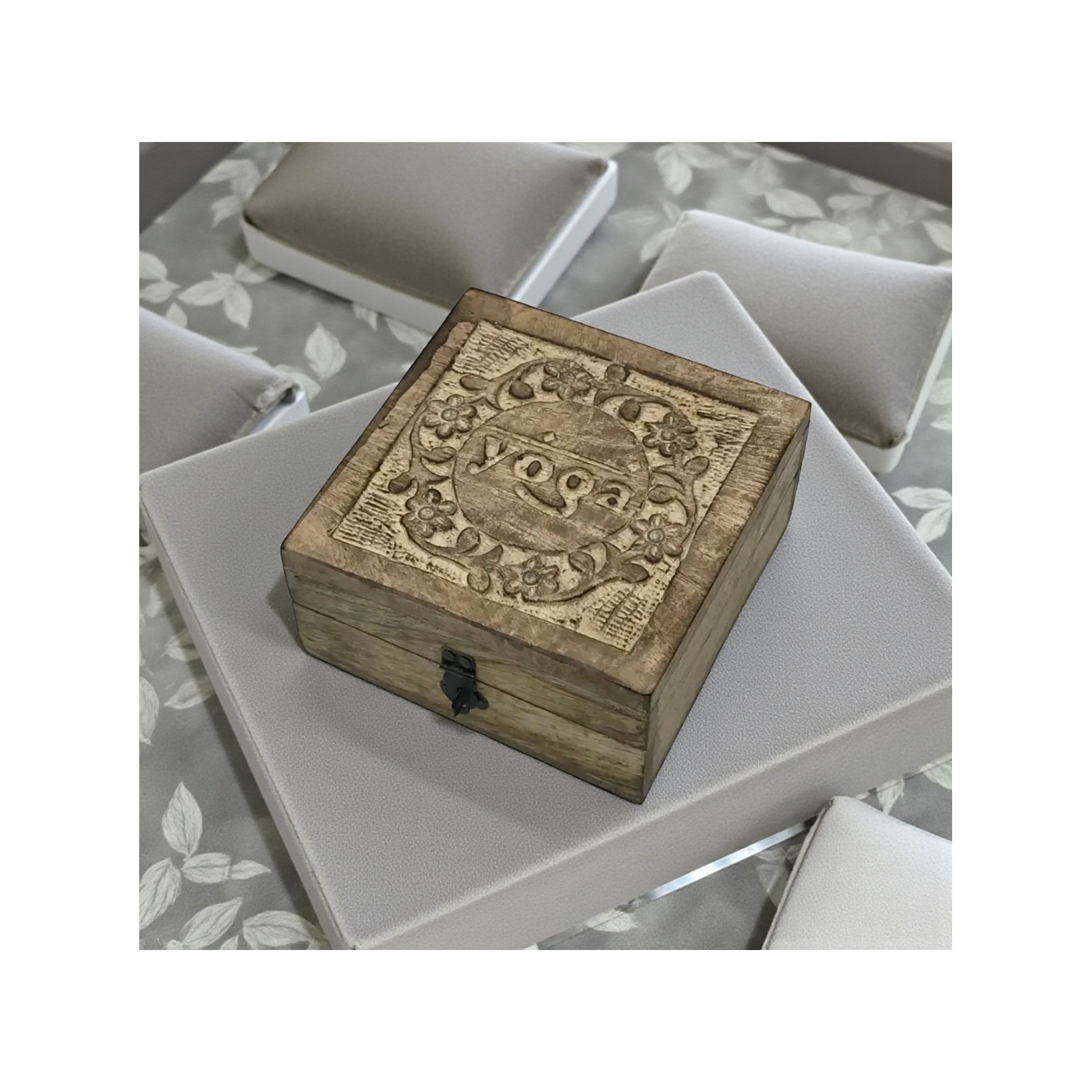 The YOGA Hand Carved Hinged Square Table Box is versatile and can be used as a decorative piece on any table or shelf. It is ideal for yoga studios meditation spaces or any store that caters to the spiritual and wellness community. The boxs elegant and unique design is sure to catch the eye of anyone who sees it.