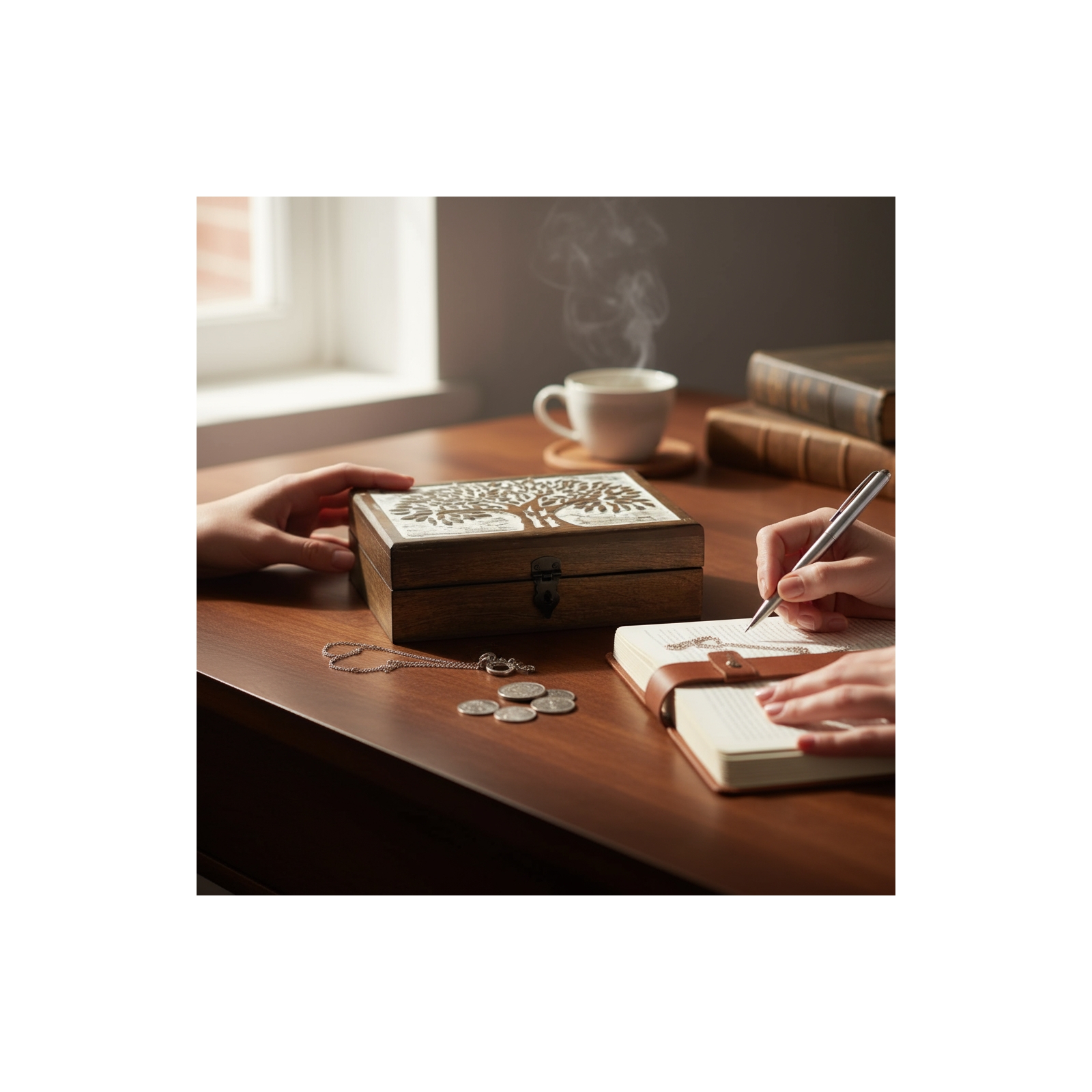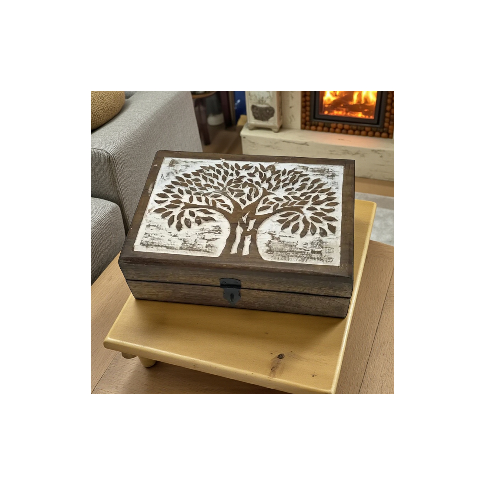 This beautiful Shade Tree Hinged Rectangle Table Box is an exquisite piece of craftsmanship hand-carved by skilled artisan wood craftsmen. Made from honey mango wood and finished with a white washed effect it exudes both elegance and rustic charm. The hinged latch ensures secure storage while the rectangular shape provides ample space for storing various items. Measuring 10 inches in length 7 inches in width and 3.25 inches in height it is the perfect size for storing remotes photos or other small items. The intricate shade tree design on the lid adds a touch of nature-inspired beauty to this stunning piece. At only $34.00 retail this table box is an affordable and practical addition to any home. Its unique design and exceptional craftsmanship make it an excellent gift for friends or family.