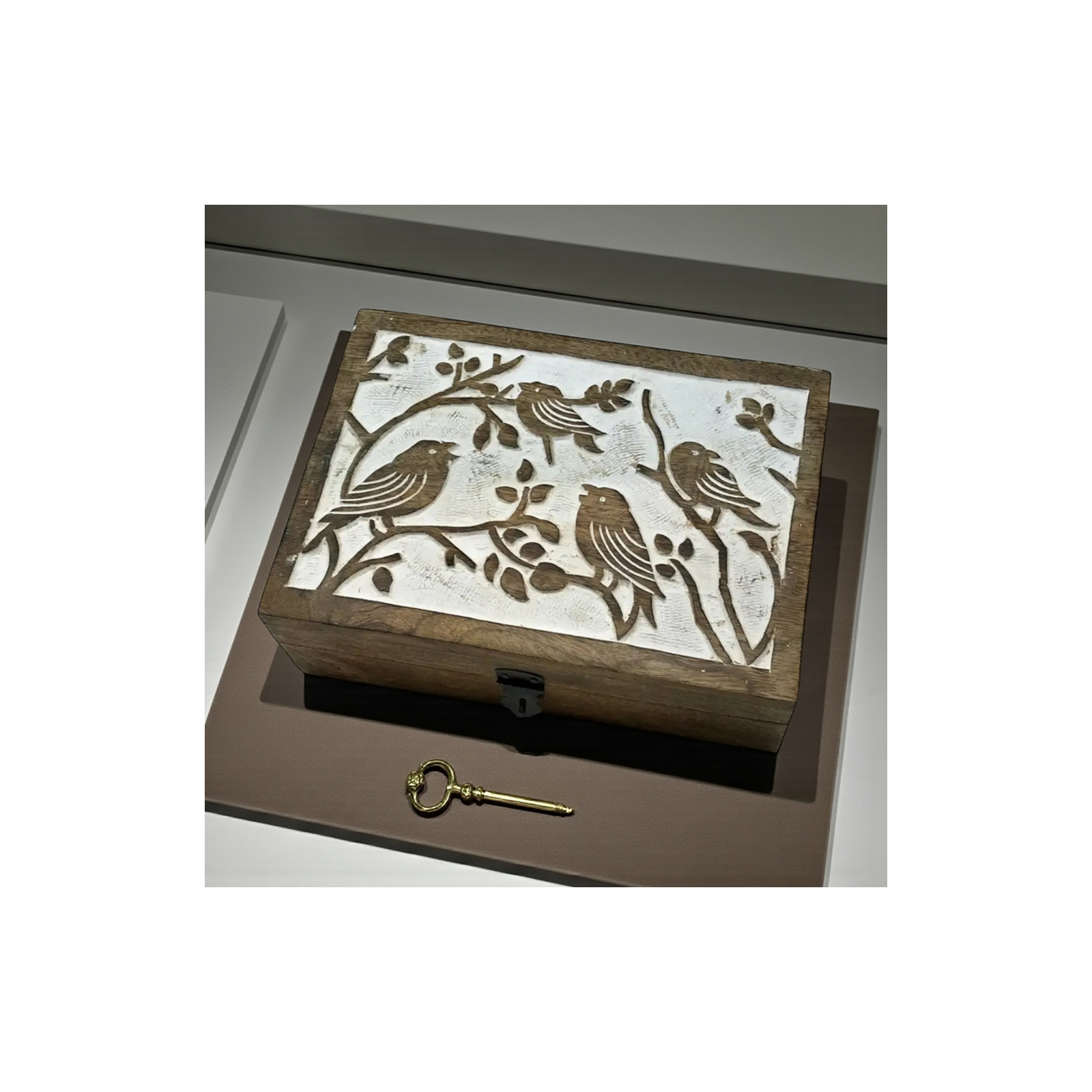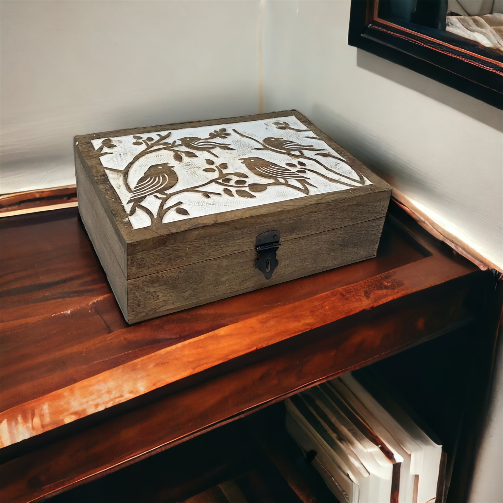 Song Birds Hinged Rectangle Table Box is a masterpiece of hand-carved craftsmanship created by skilled artisan wood craftsmen. Made from honey mango wood and finished with a white washed effect it combines elegance with a rustic charm. The hinged latch ensures secure storage while the rectangular shape provides ample space for storing various items in the kitchen bath bedroom or office. Measuring 10 inches in length 7 inches in width and 3.25 inches in height it is the perfect size for storing jewelry keepsakes or other small items. The intricate song bird design on the lid adds a touch of nature-inspired beauty to this stunning piece. The details of the birds the tree branches and leaves create a sense of movement and life. At only $34.00 retail this table box is an affordable and practical addition to any home. Its exceptional craftsmanship and unique design make it an excellent gift for friends or family who love nature-inspired decor.