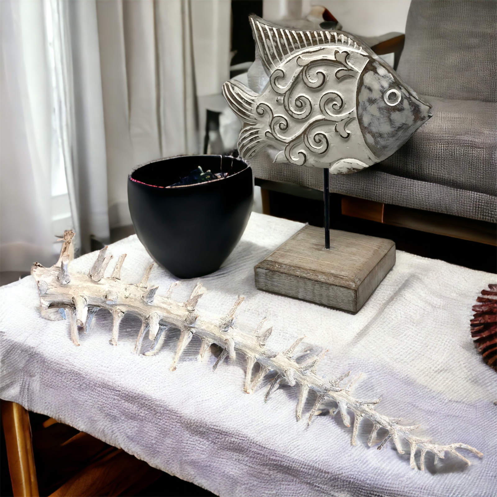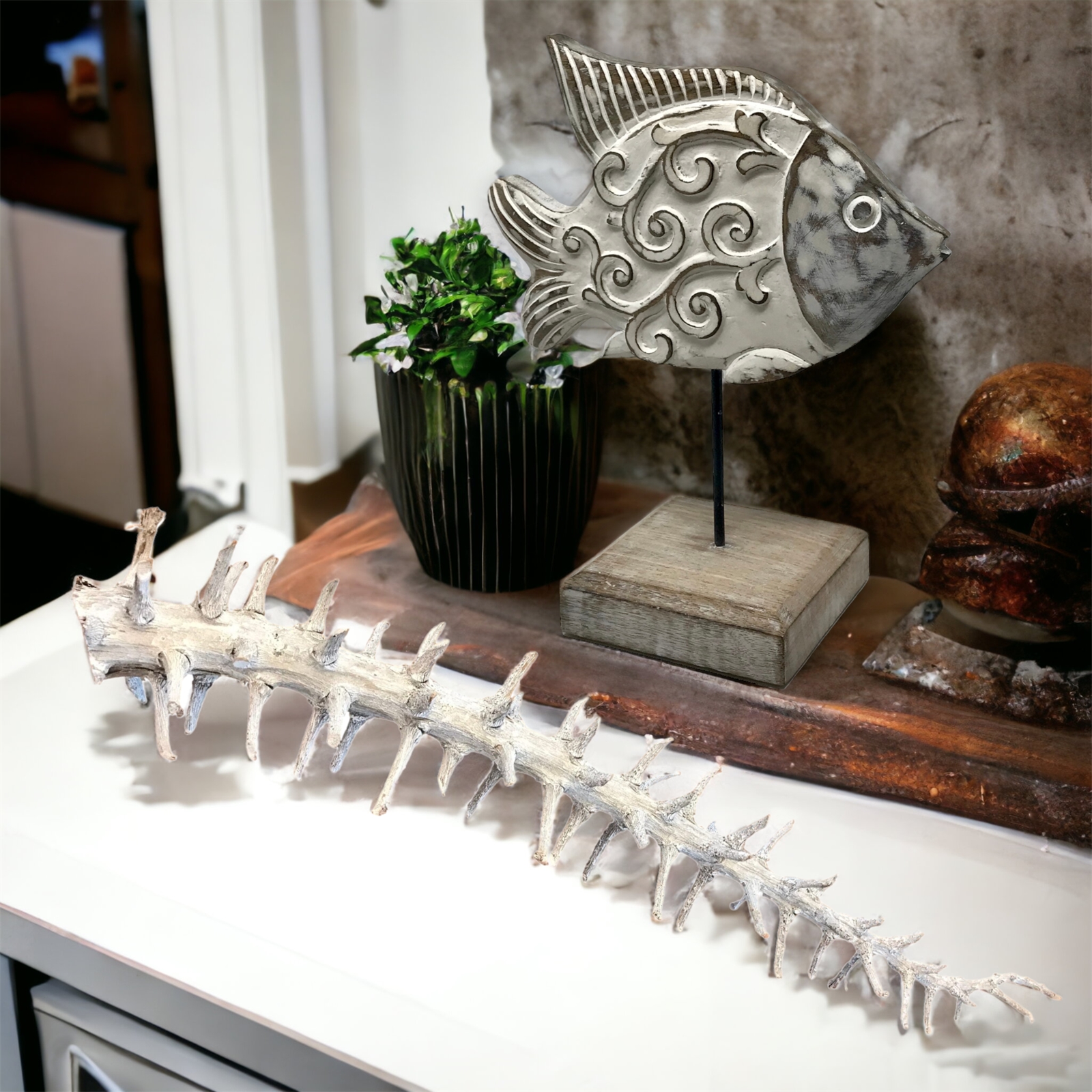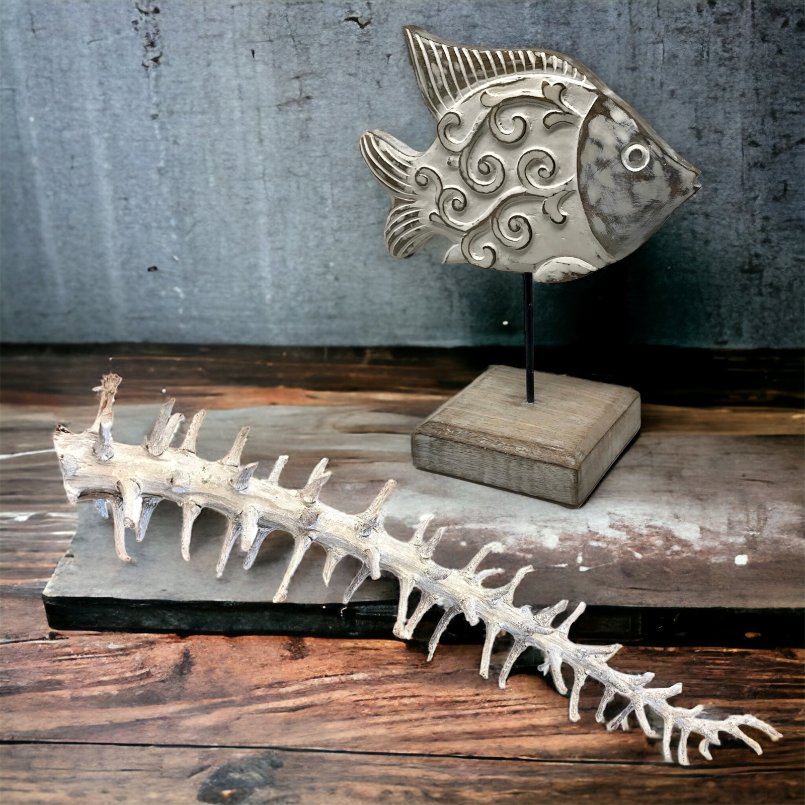 Beau Butterfish from our collection Fish Tales - hand-carved mango wood fish sculpture mounted on a post and pedestal base made by skilled Indian artisans and hand-finished in a white distressed patina. Each figure is named adding a unique touch to this stunning collection.