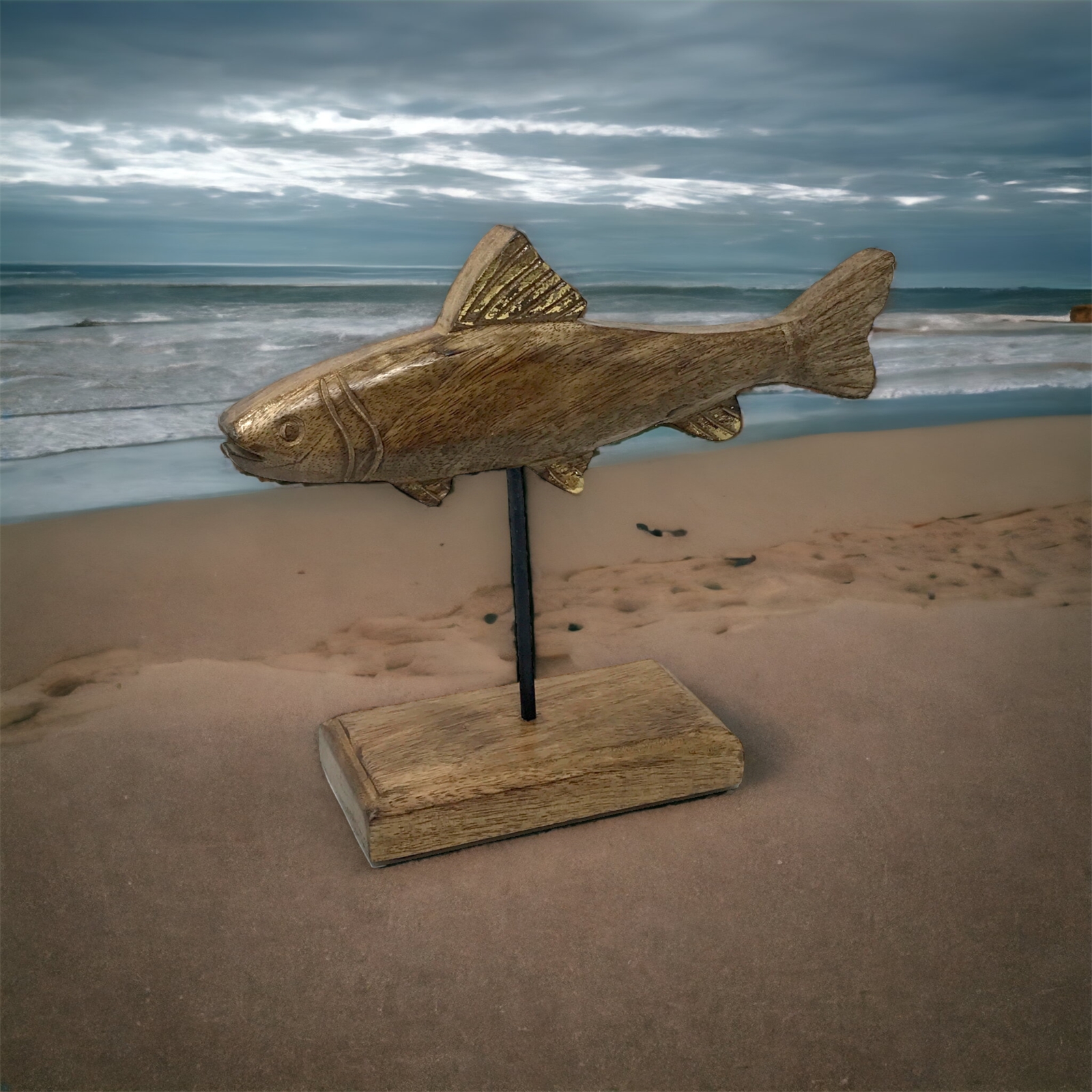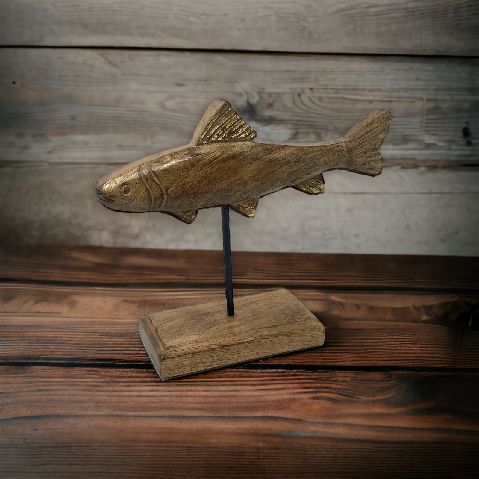 Timmy Trout from our collection Fish Tales - hand-carved mango wood fish sculpture mounted on a post and pedestal base made by skilled Indian artisans and hand-finished in a honey stain with gold foil patina. Each figure is named adding a unique touch to this stunning collection.