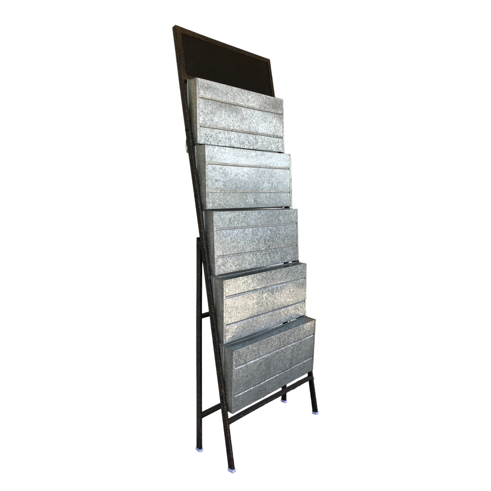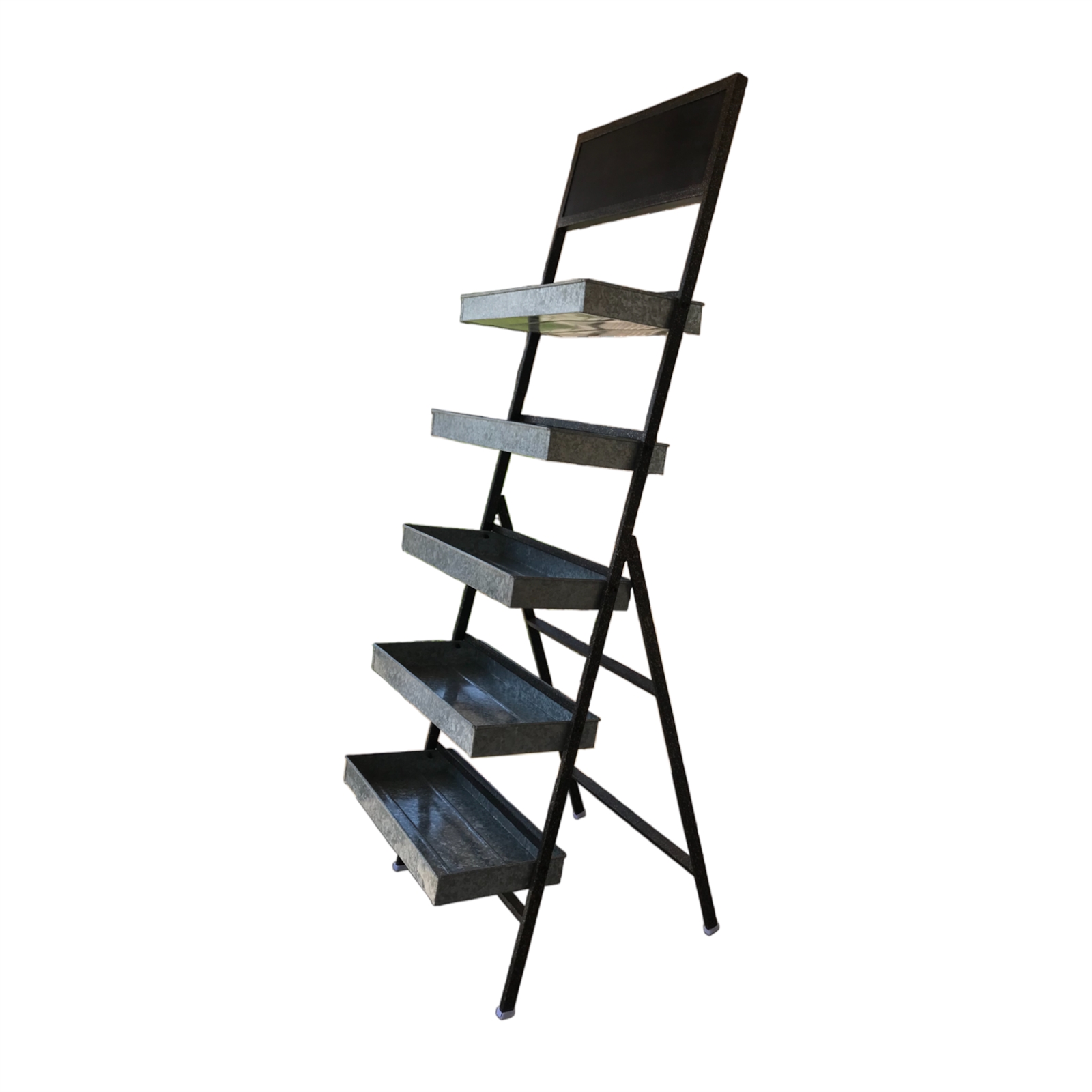 Galvanized Tray Shelves feature a subtle incline which prevents water from pooling making this fixture the perfect solution for displaying fresh plants and other water-sensitive items. Each of the five galvanized tray shelves measures 25 wide x 10 front to back providing ample space to showcase your products elegantly. The 2 high edges keep items secure and visually appealing. If more space is needed between shelves simply leave a shelf in folded position.
