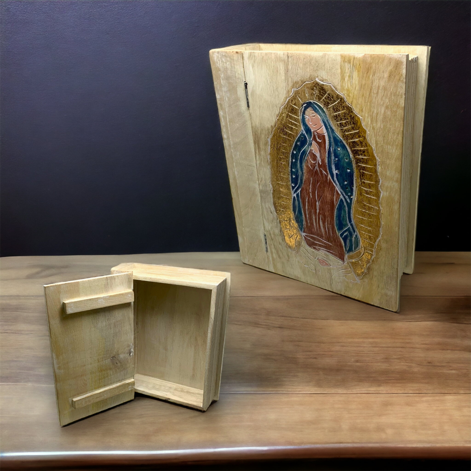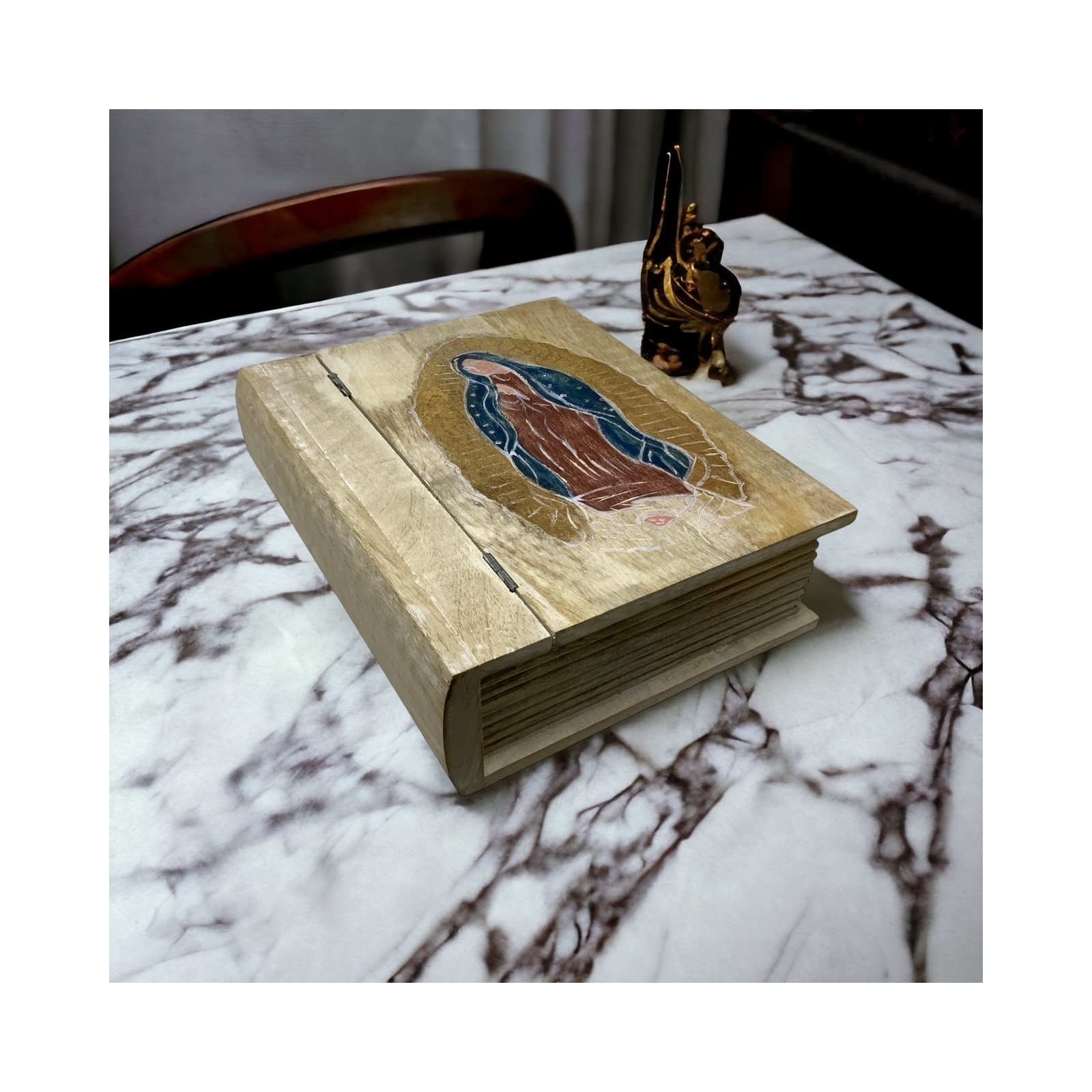 Hand-Carved Virgin of Guadalupe Hinged Book Box. Laboriously carved with attention to fine details by Indian Artisans each box is completely handmade! Large enough to hold the family bible portrait photos and important legal and memorial documents. Inside cover is hand sanded to provide a smooth surface for engraving. Each treasure is individually boxed in ground-ship worthy carton perfect for e commerce. This is heirloom quality craftsmanship!