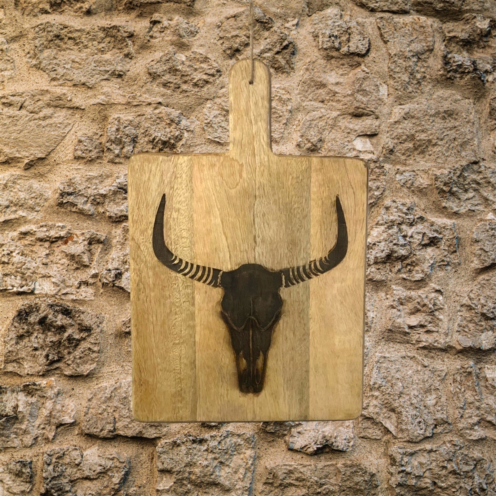 Branding Iron Mango Wood Longhorn Skull Cutting Board handcrafted in India with precision and care. This cutting board features a sturdy paddle handle made of durable mango wood providing a comfortable grip for effortless chopping dicing and slicing.