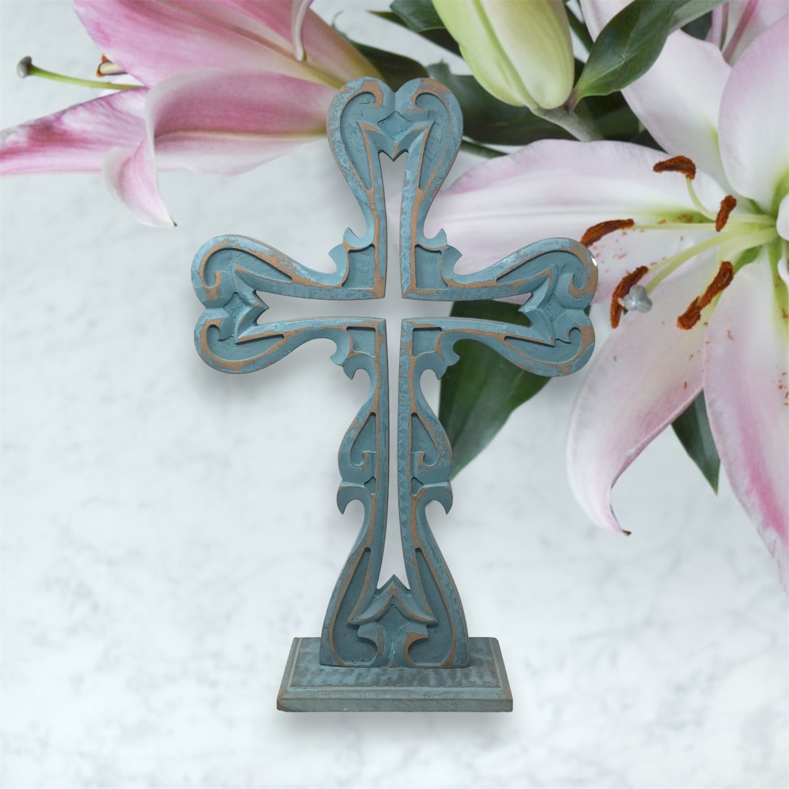 The cross is finished with a distressed light blue patina adding a rustic charm and a sense of timeless beauty. Its 12x4x18.5 size makes it a perfect centerpiece effortlessly drawing attention and becoming a focal point in any room.
