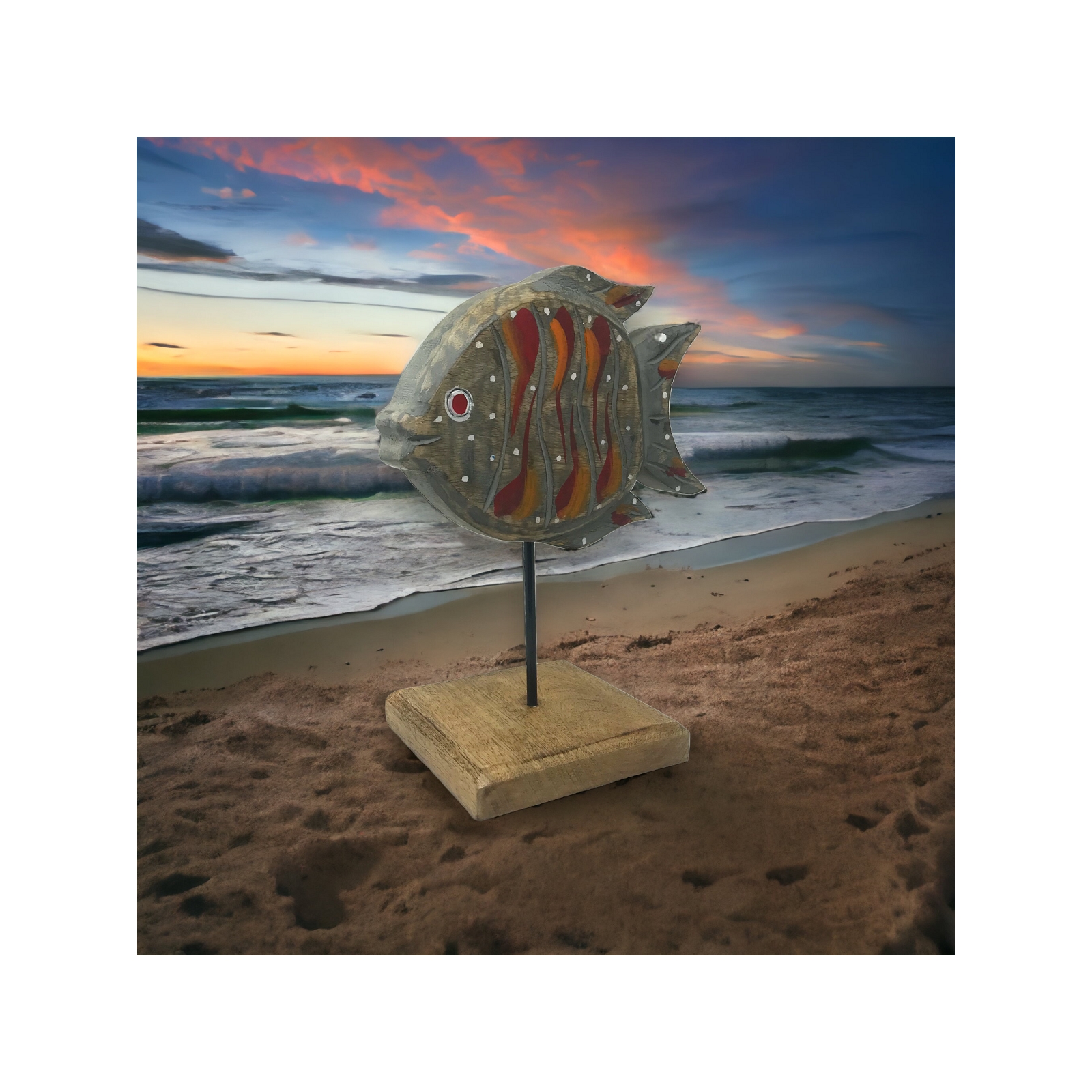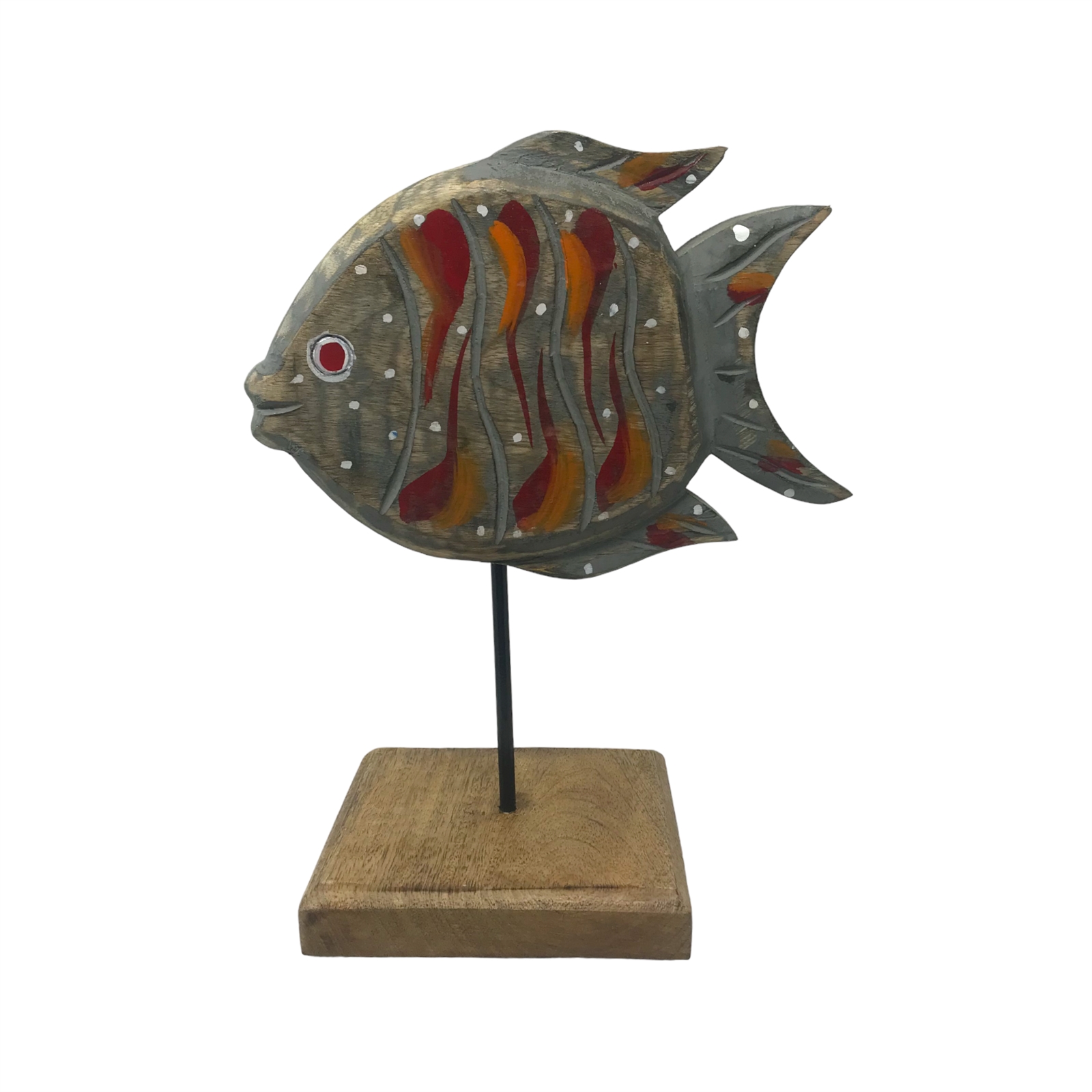 Aggie is a captivating Mango Wood Hand-Carved Angel Fish sculpture skillfully crafted in India. This exquisite artwork showcases the mastery of artisans intricately carved from luxurious mango wood. Aggie gracefully rests on a solid mango wood base securely attached with a metal rod ensuring stability. The base is thoughtfully designed with rubber cushion pads providing a secure grip and protecting surfaces. With dimensions of 8x5x10 high Aggies presence commands attention while fitting harmoniously into any space. Hand-painted in vibrant shades of red and orange delicately layered on top of a grey distressed base this sculpture exudes a timeless vintage allure. The meticulous carving on all sides showcases the craftsmanship and attention to detail. Aggies stunning beauty and artistic charm are apparent from every angle. This exceptional Mango Wood Hand-Carved Angel Fish sculpture Aggie promises to be a cherished addition to your living space infusing it with elegance and a touch of enchantment.