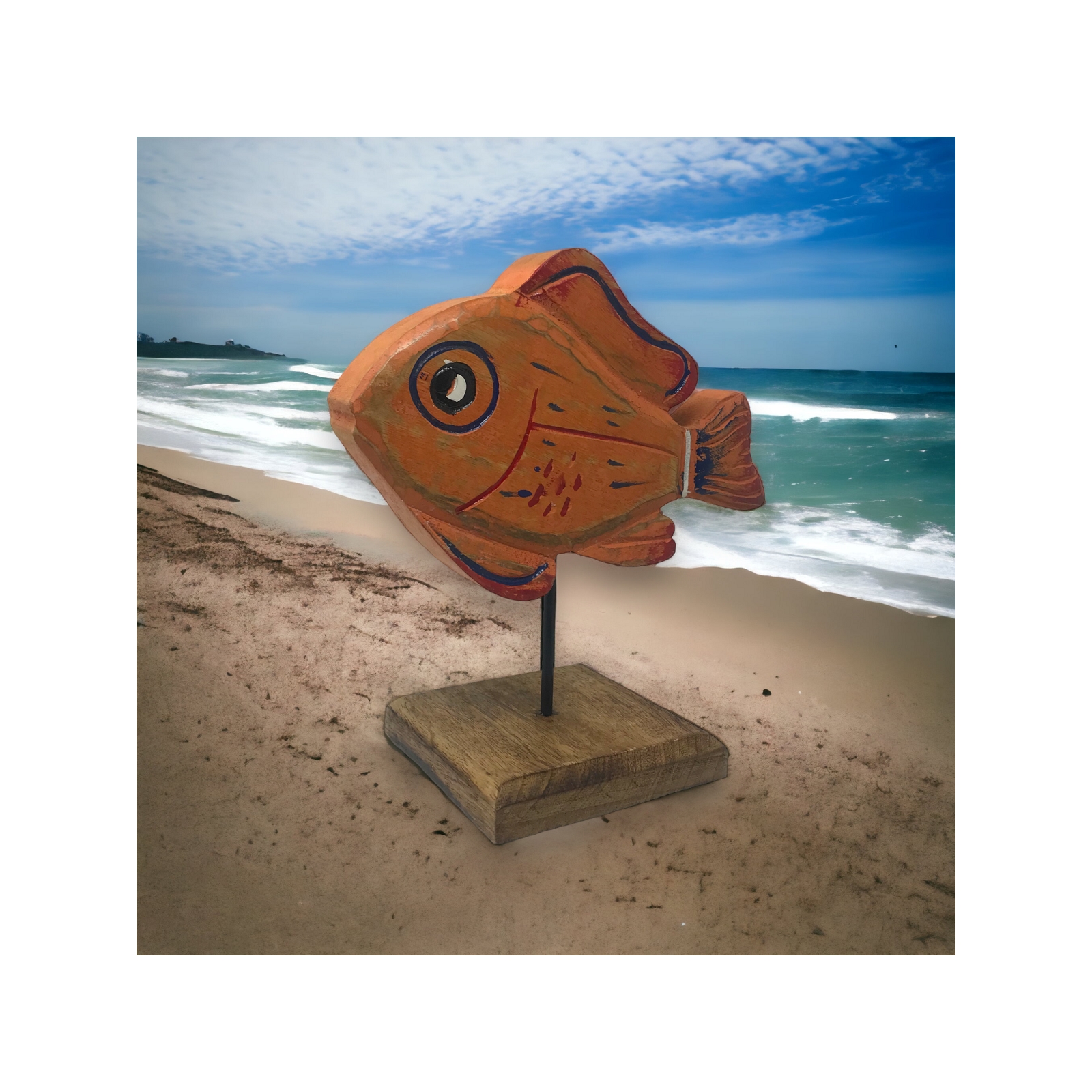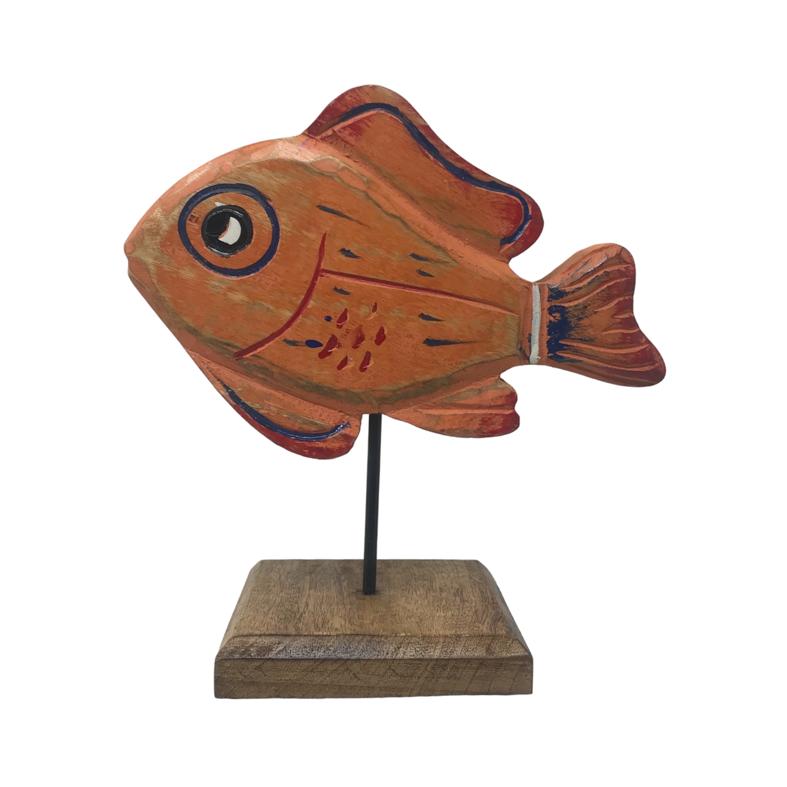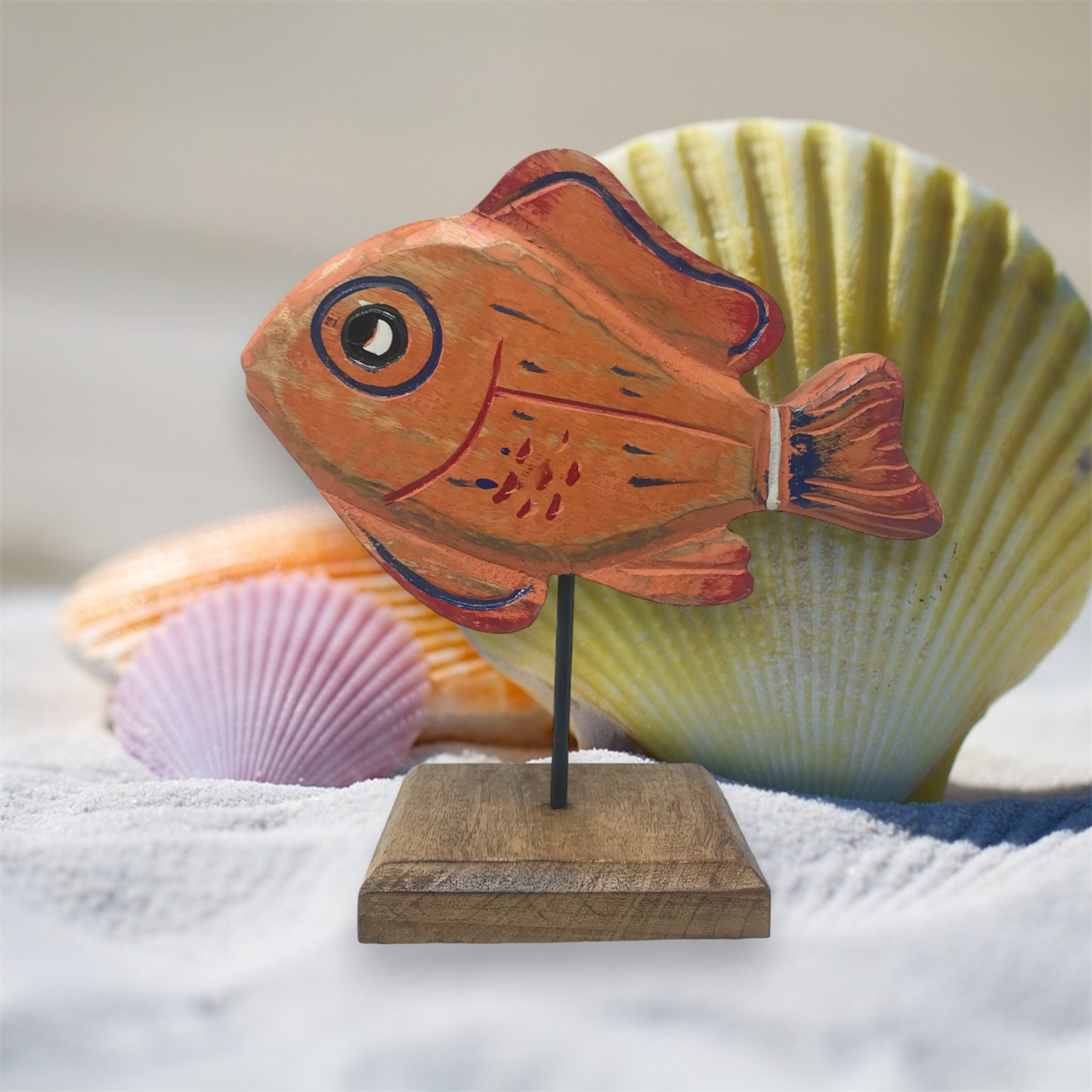Gordy is a mesmerizing Mango Wood Hand-Carved Gold Fish sculpture expertly crafted in India. This exquisite artwork showcases the skill and creativity of artisans meticulously carved from luxurious mango wood. Gordy elegantly rests on a solid mango wood base firmly attached with a metal rod ensuring stability and durability. The base features rubber no-slip cushion pads providing a secure grip and safeguarding surfaces. With dimensions of 9.5x5x10 high Gordy commands attention while seamlessly fitting into any space. The hand-painted colors of red and blue expertly applied on top of an orange distressed base infuse Gordy with a worn vintage charm that adds character and nostalgia to its aesthetic. The sculpture is intricately carved on all sides allowing for a captivating view from every angle. Gordy the Mango Wood Hand-Carved Gold Fish is a captivating piece that will enhance any living space bringing a touch of artistry elegance and a hint of nostalgia to your home.