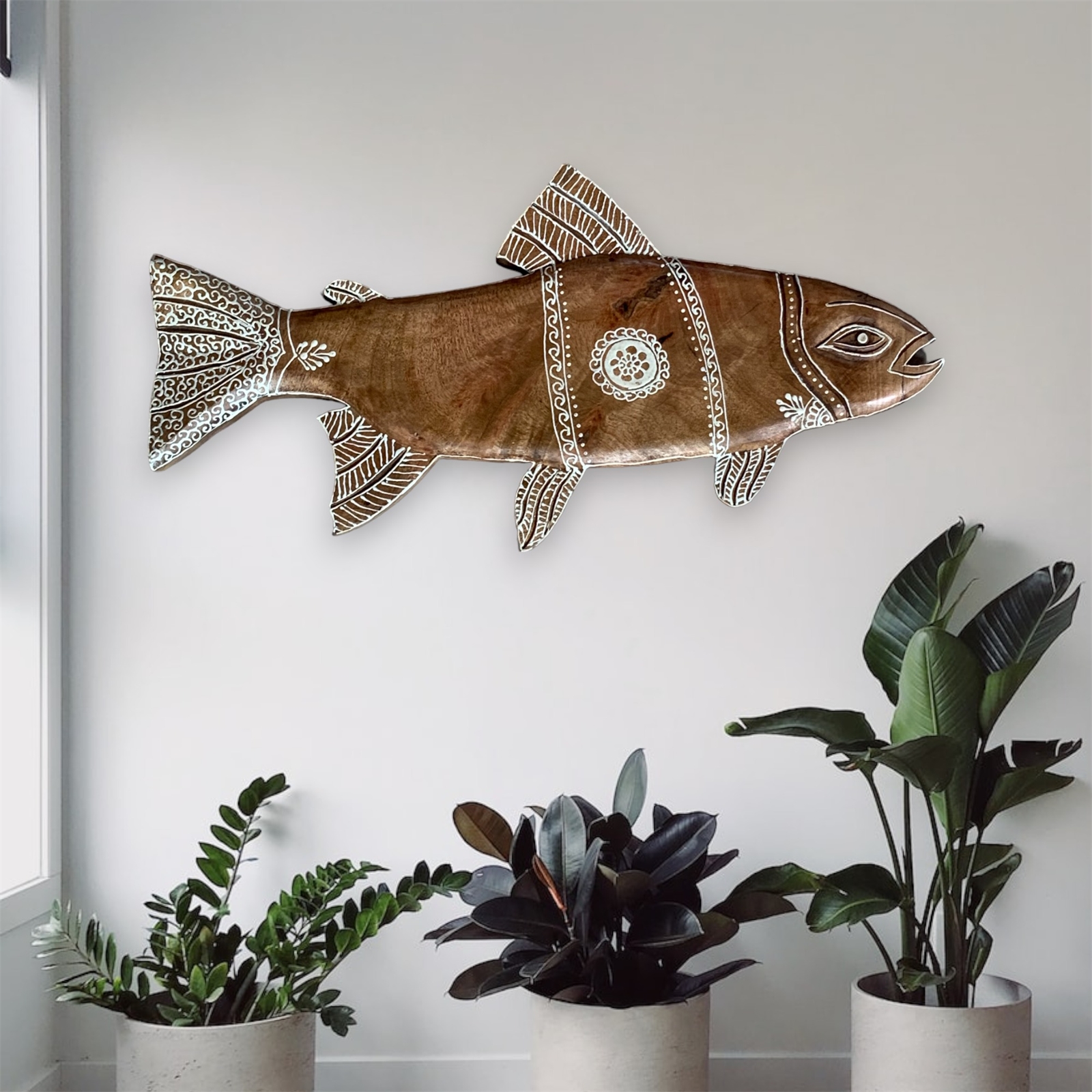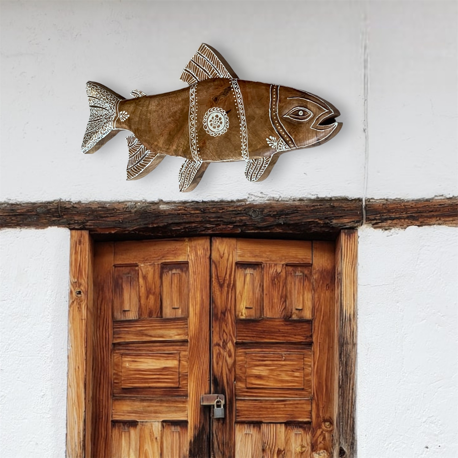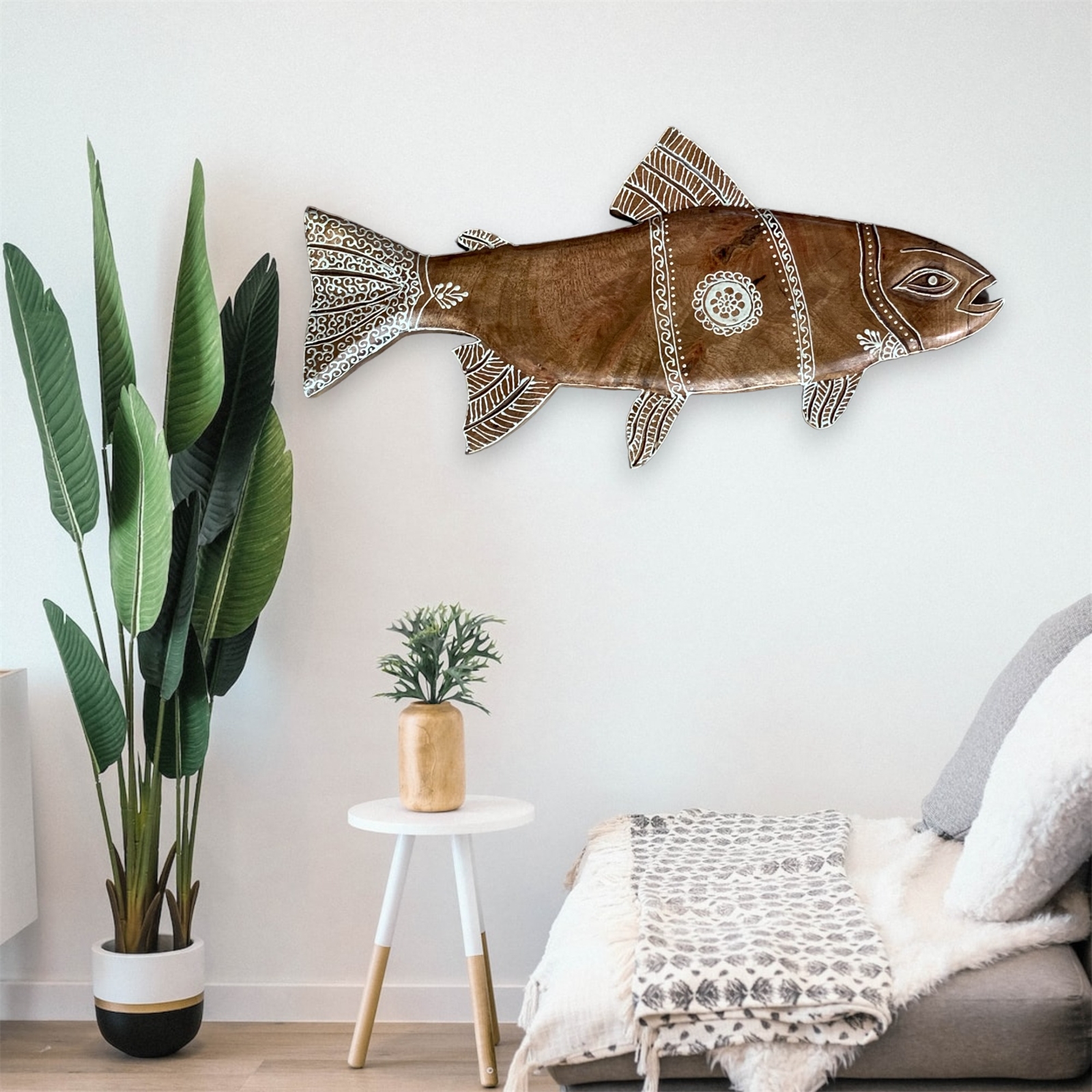 What sets this piece apart is the meticulous Hand Detailed Henna Painting in Cream White, adding a touch of artistic elegance to the natural mango wood canvas. The intricate patterns enhance the bonefish carving, creating a harmonious blend of art and nature.