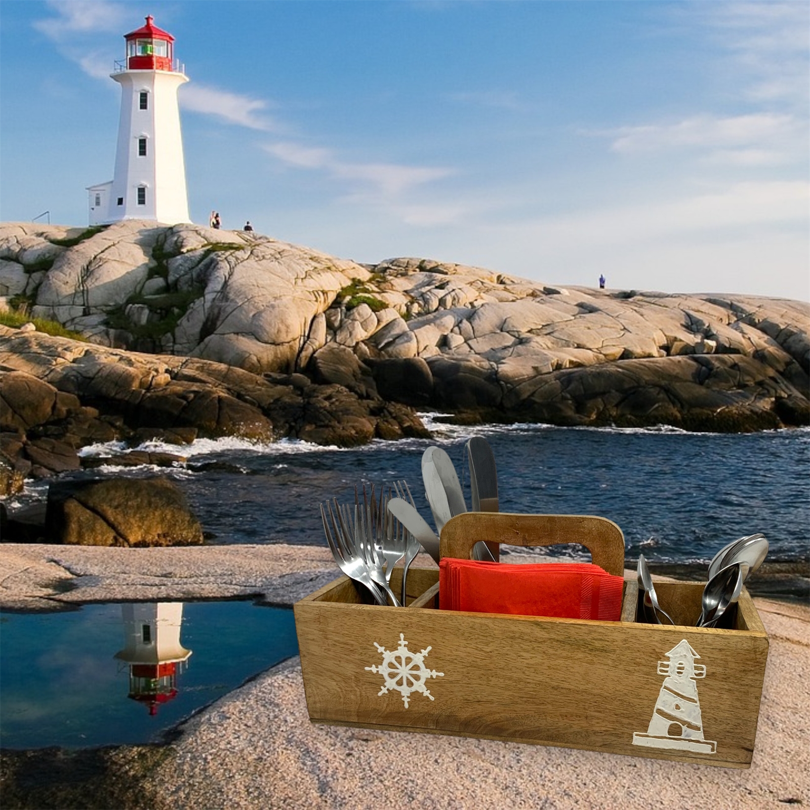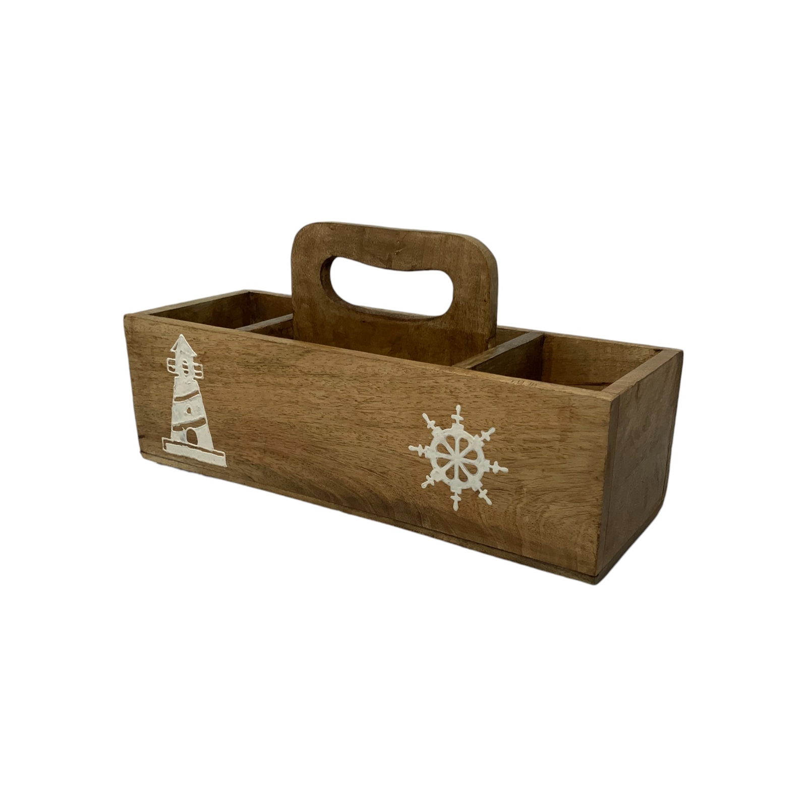 Solid Mango Wood Caddy, a functional work of art handcrafted in India that seamlessly combines versatility with captivating nautical themes. Crafted from premium mango wood, this caddy stands out with its honey stained finish, enhancing the natural beauty of the wood grain while providing a warm and inviting aesthetic.