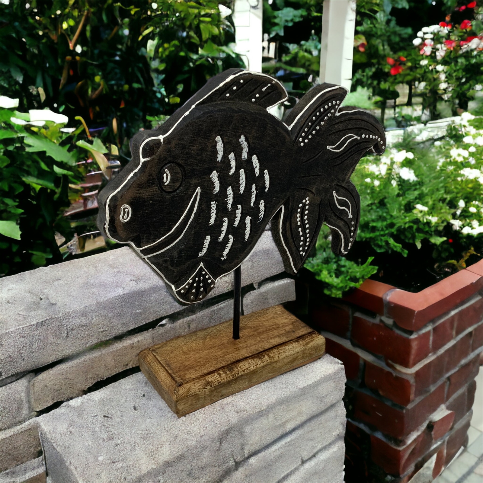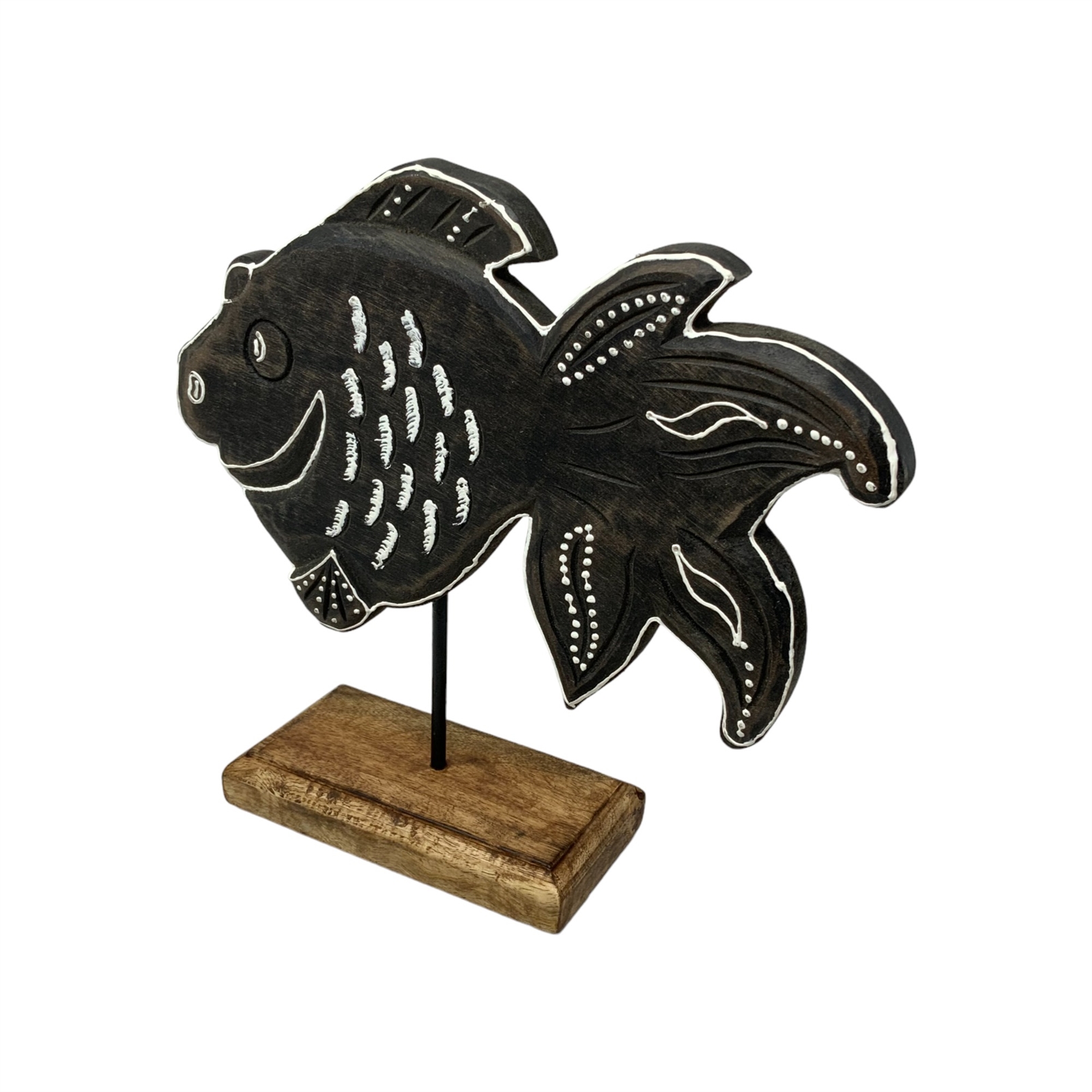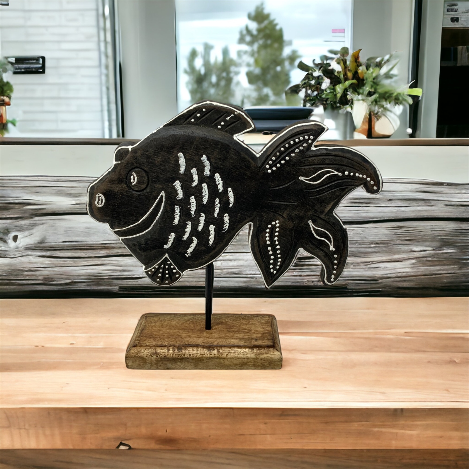 Introducing Morton Molly from our Fish Tales Collection – a captivating hand-carved wood tabletop sculpture that seamlessly merges artisanal craftsmanship with coastal charm. This exquisite fish, mounted on a wooden pedestal with a sturdy metal rod, is a testament to the skilled artisans in India who bring this piece to life.