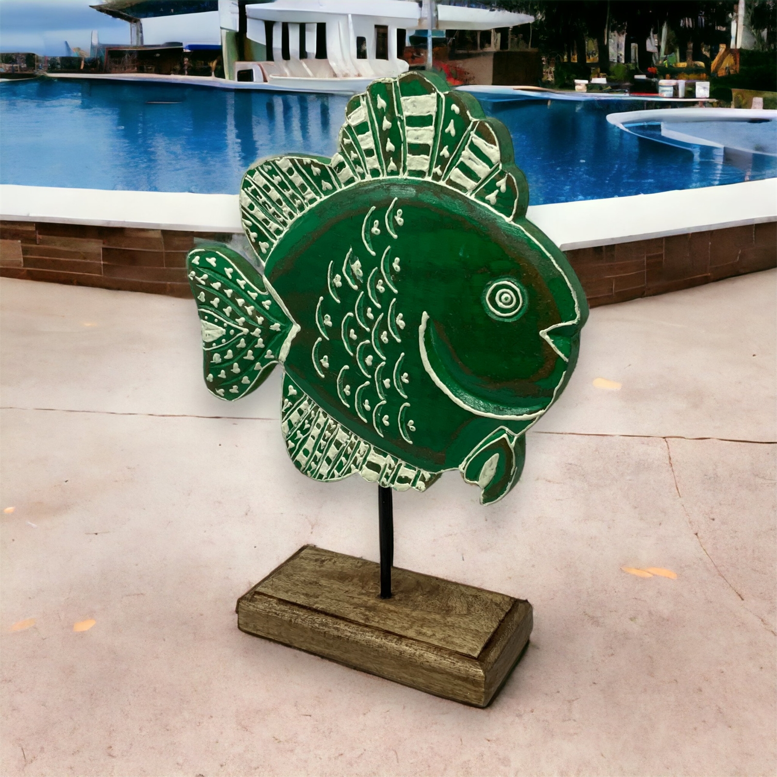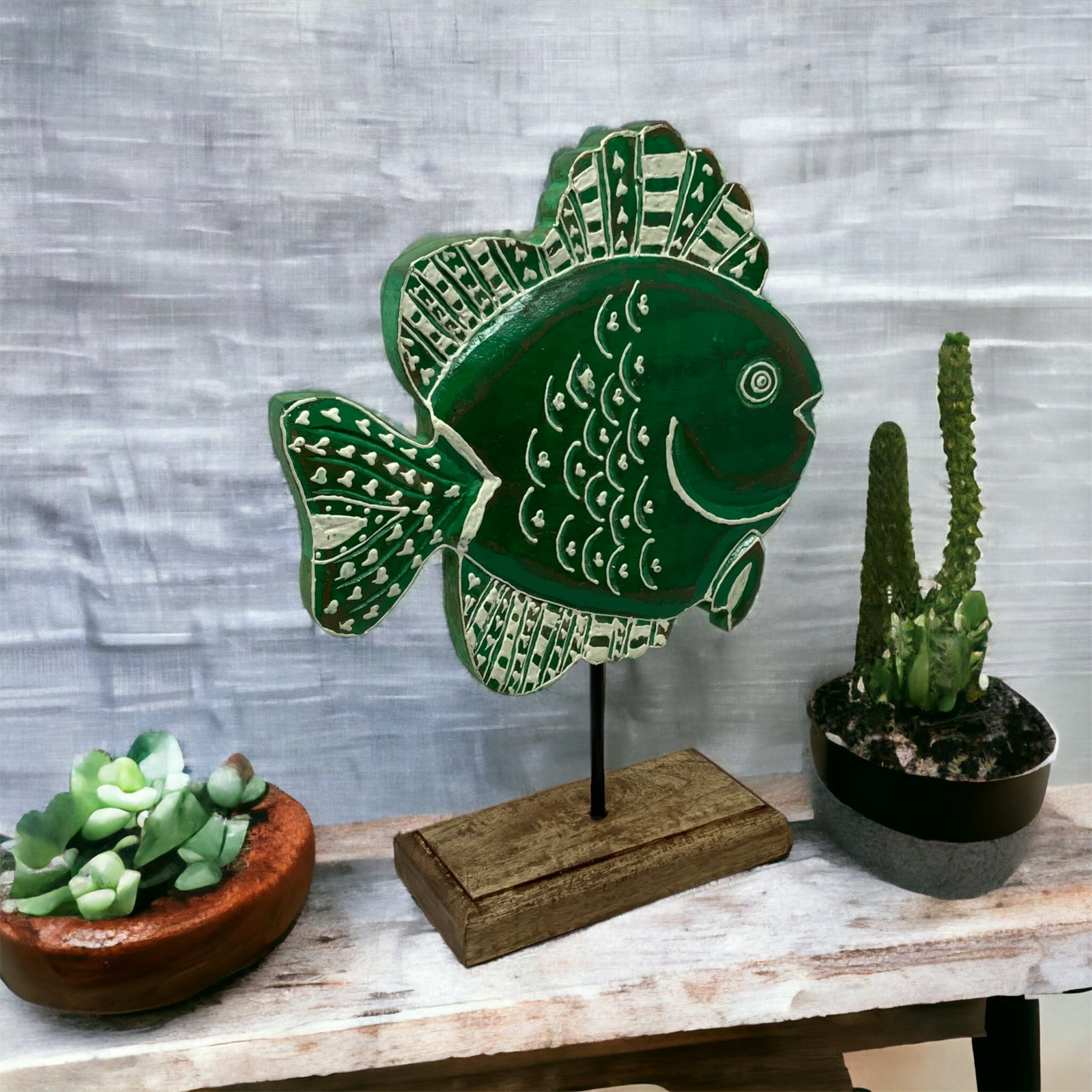 Introducing Wasabi from our Fish Tales Collection – a captivating hand-carved wood tabletop sculpture that seamlessly merges artisanal craftsmanship with coastal charm. This exquisite fish, mounted on a wooden pedestal with a sturdy metal rod, is a testament to the skilled artisans in India who bring this piece to life.