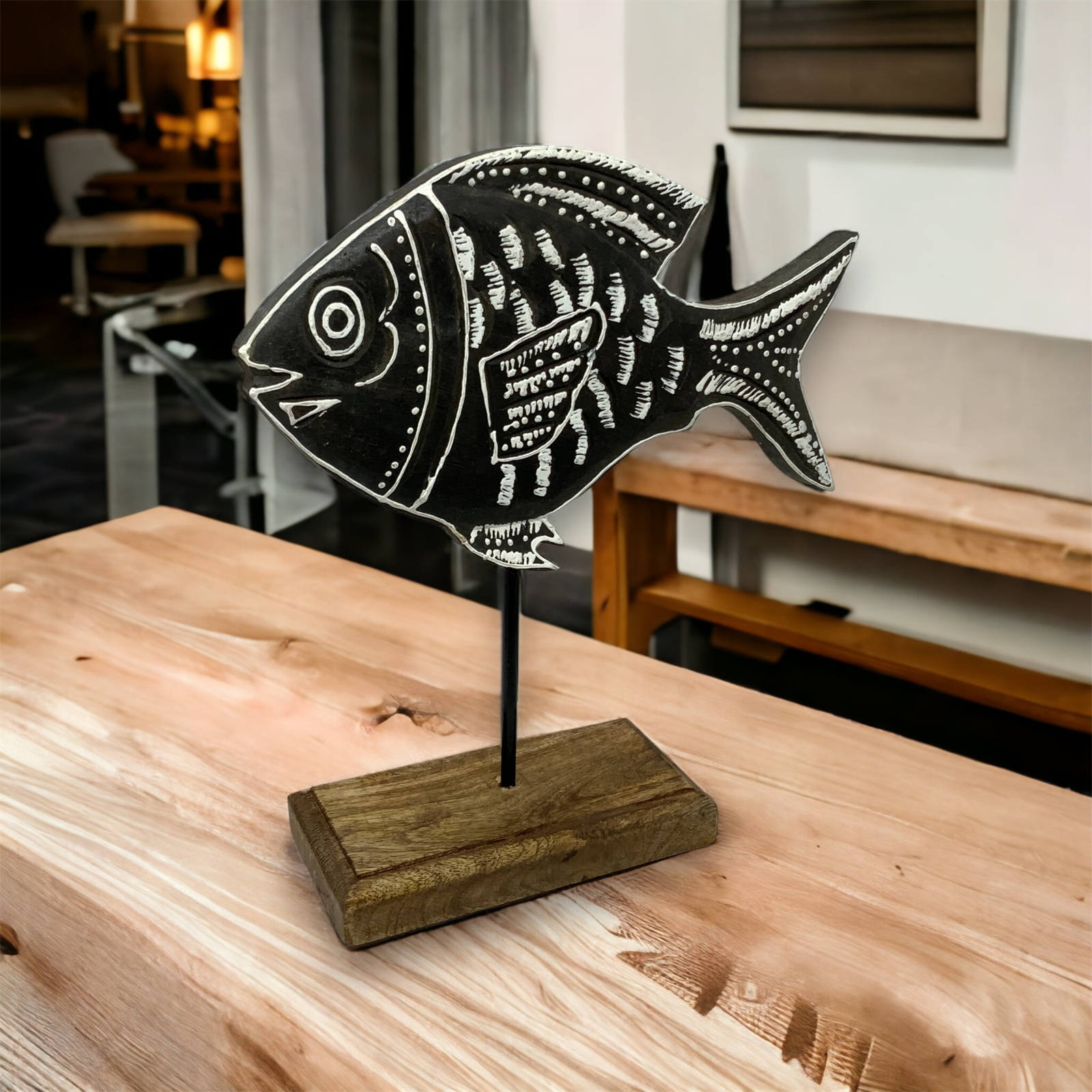 Introducing Black Sparrow from our Fish Tales Collection – a captivating hand-carved wood tabletop sculpture that seamlessly merges artisanal craftsmanship with coastal charm. This exquisite fish, mounted on a wooden pedestal with a sturdy metal rod, is a testament to the skilled artisans in India who bring this piece to life.