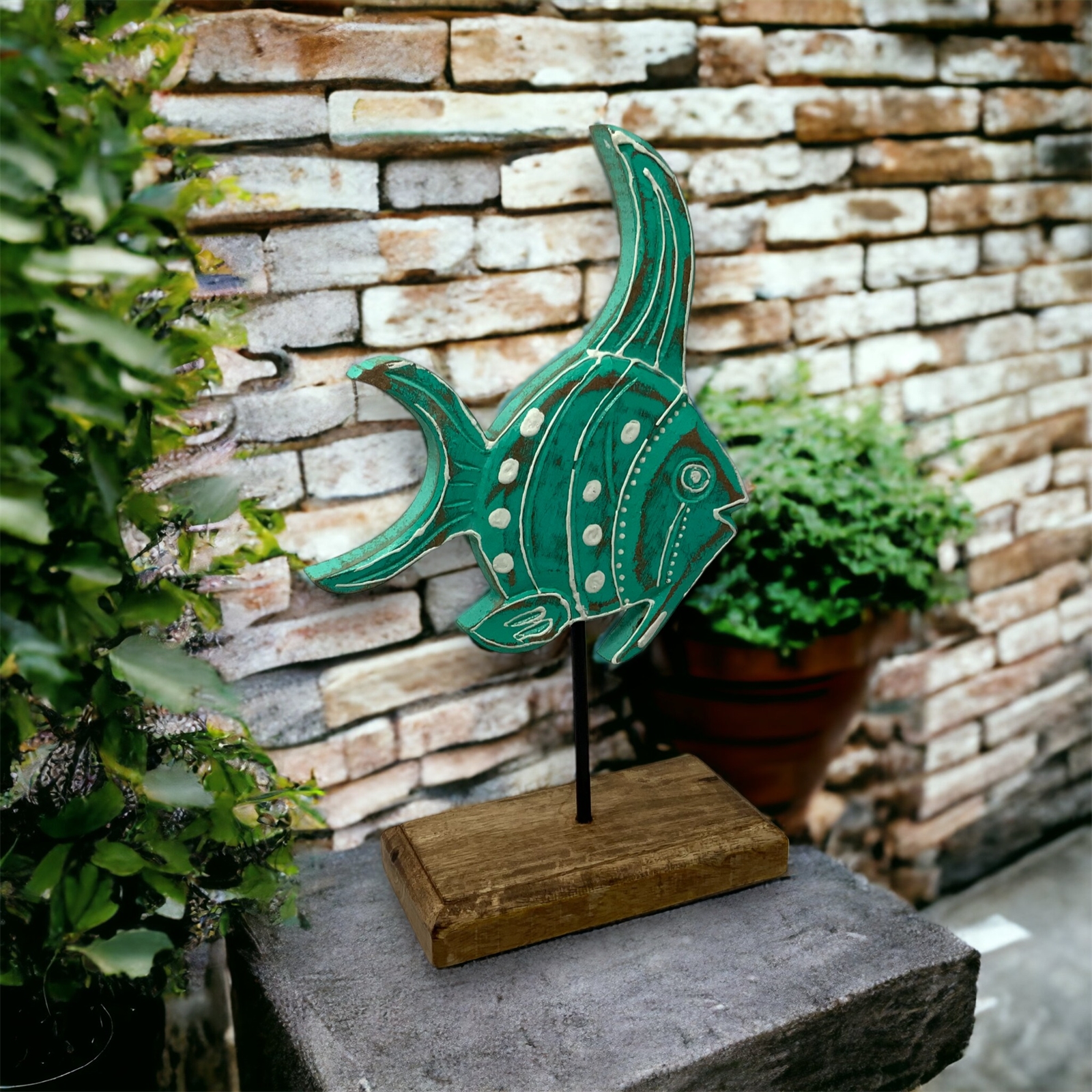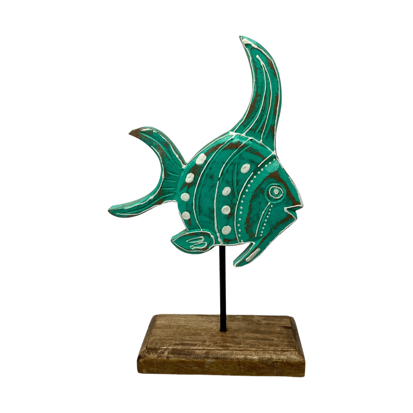 Introducing Agatha Angel from our Fish Tales Collection – a captivating hand-carved wood tabletop sculpture that seamlessly merges artisanal craftsmanship with coastal charm. This exquisite fish, mounted on a wooden pedestal with a sturdy metal rod, is a testament to the skilled artisans in India who bring this piece to life.