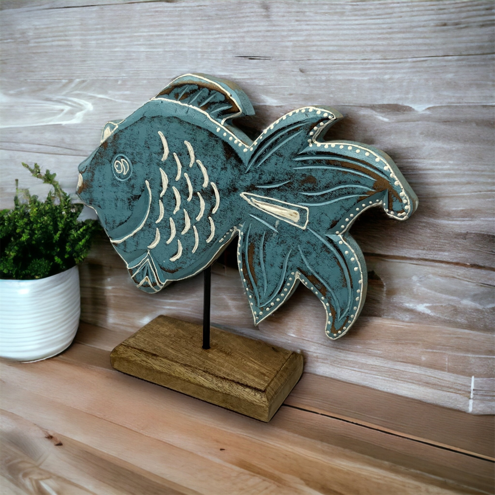 Introducing Gomez Goldfish from our Fish Tales Collection – a captivating hand-carved wood tabletop sculpture that seamlessly merges artisanal craftsmanship with coastal charm. This exquisite fish, mounted on a wooden pedestal with a sturdy metal rod, is a testament to the skilled artisans in India who bring this piece to life.