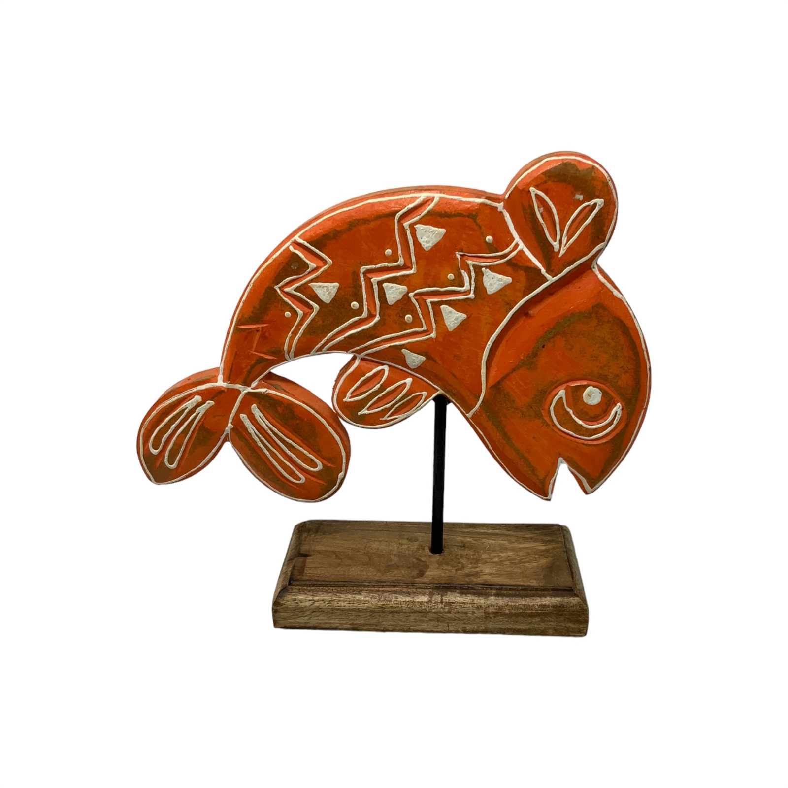 Introducing Tangerine from our Fish Tales Collection – a captivating hand-carved wood tabletop sculpture that seamlessly merges artisanal craftsmanship with coastal charm. This exquisite fish, mounted on a wooden pedestal with a sturdy metal rod, is a testament to the skilled artisans in India who bring this piece to life.