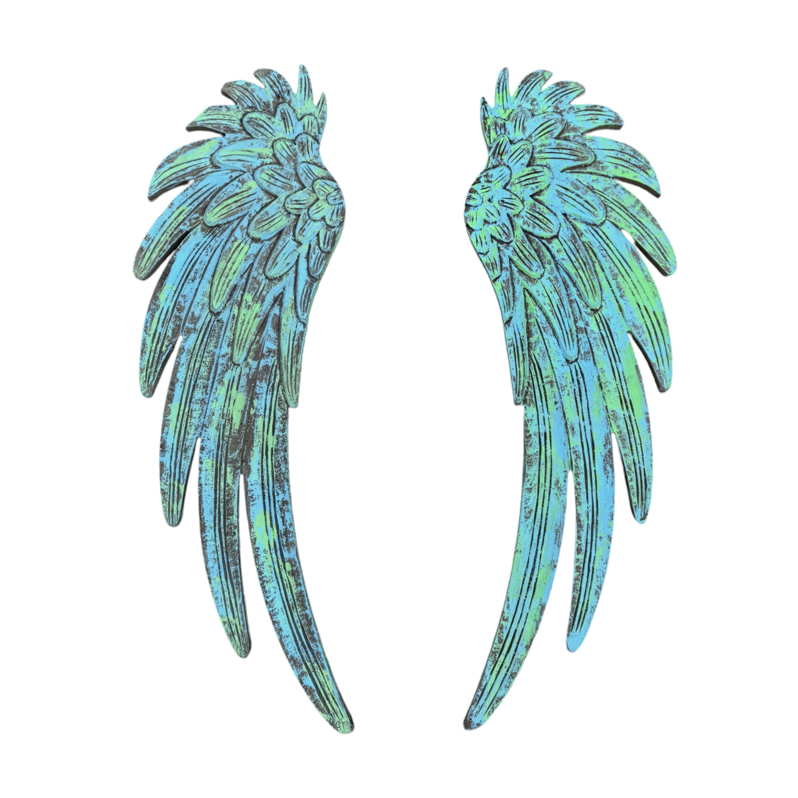 Bring a touch of celestial charm to your home decor with the Zadkiel Angel Wings, a stunning pair of MDF wood wall decor handcrafted in India. Each wing is intricately carved and finished in a distressed Verdis Gris Patina with Blue Highlights.