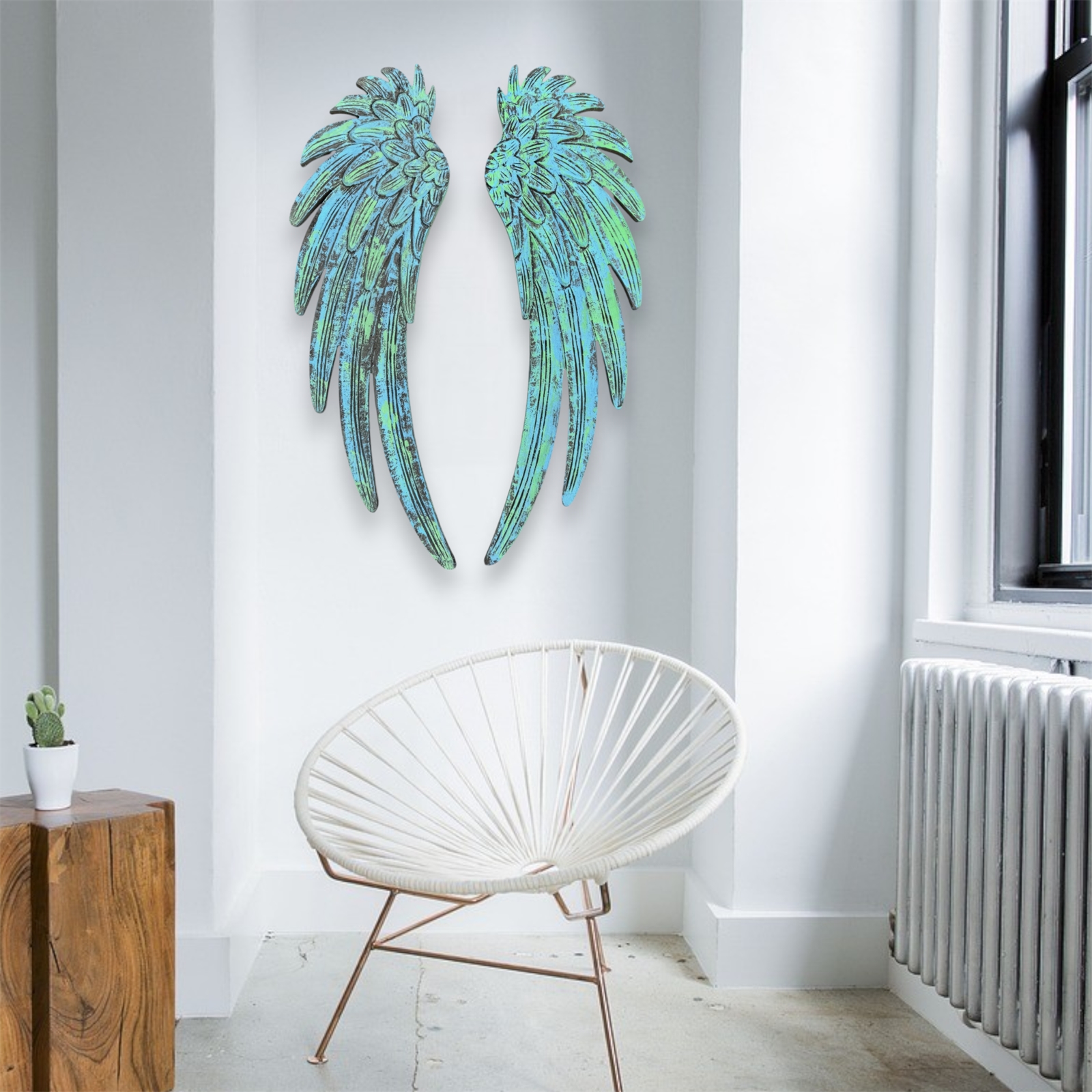 Measuring 11 wide x 35.75 high PER WING and with a thickness of 3/8, these versatile wings can be hung vertically for a classic look or arranged in a V-shape to symbolize victory and inspiration. Whether adorning a nursery, child’s bedroom, or a serene corner of your home decor, their uplifting design will radiate peace and grace.