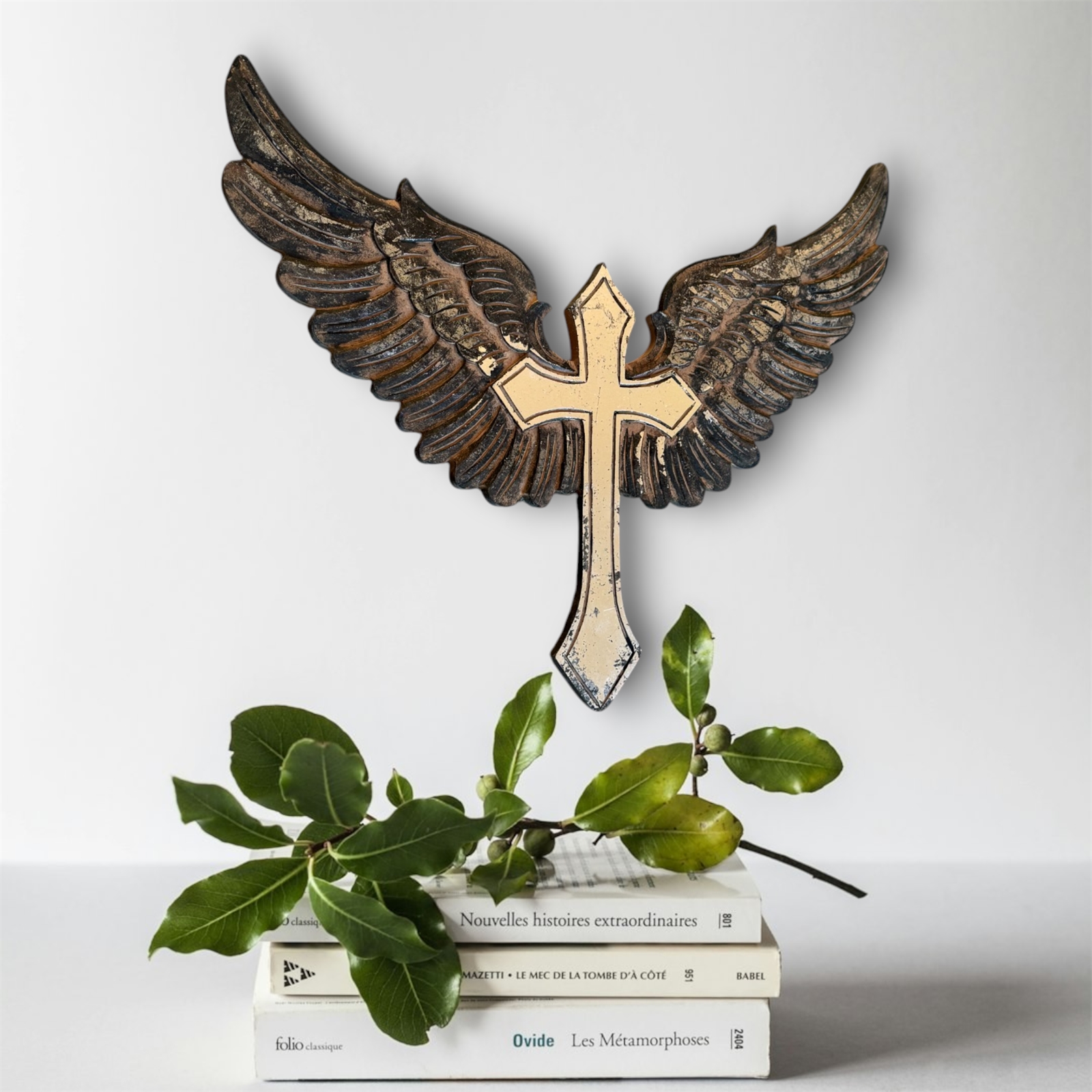 Add a touch of serenity and inspiration to your space with Jophiel Carved Wood Cross with Angel Wings Wall Decor. Expertly handmade in India, this stunning piece showcases intricate detailing with gracefully carved angel wings embracing a central cross, symbolizing faith, hope, and protection.