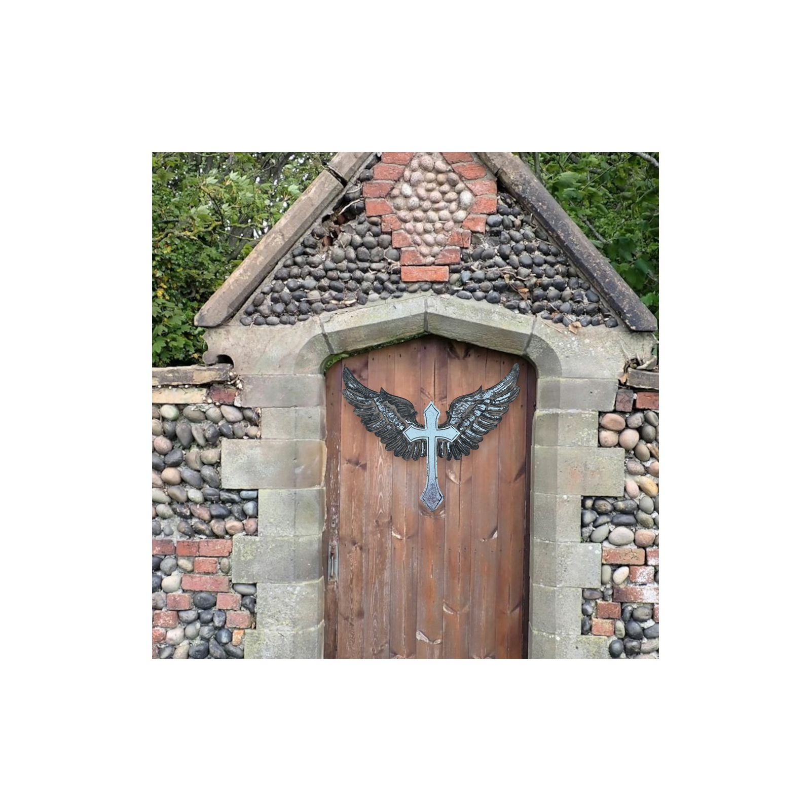 The cross is finished in a distressed charcoal grey that exudes timeless elegance, while delicate silver foil adornments enhance its refined and meaningful design. Measuring 22 wide x 18 tall x 3/8 thick, this lightweight decor is perfect for hanging in a living room, bedroom, or remembrance area, offering a spiritual focal point for any wall.