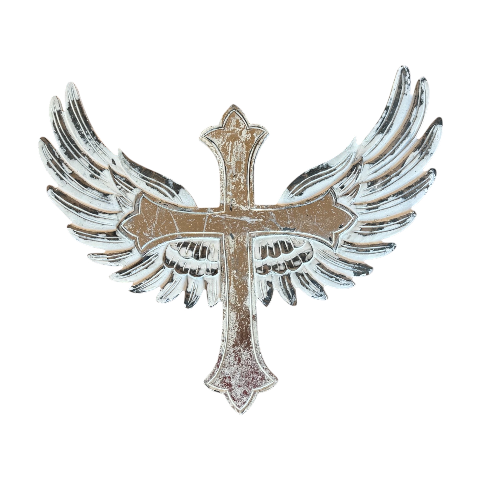 The cross is finished in a distressed white with Silver Foil on Cross, giving it a unique, timeworn elegance. Measuring 24 wide x 20 tall x 3/8 thick, this lightweight wall decor mounts effortlessly with two sturdy keyhole hangers, ensuring secure and easy display.