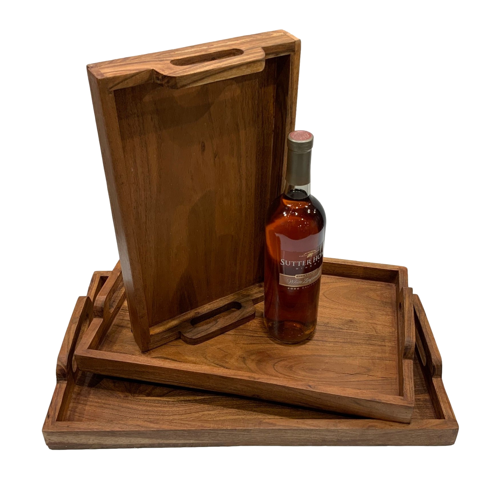 This set of three serving/charcuterie trays is the perfect addition to any home. Crafted from Acacia Wood these solid wood trays are food-safe sturdy and designed to last. The large tray measures 20 x 12 x 2 high while the other two trays nest inside for easy storage when not in use.