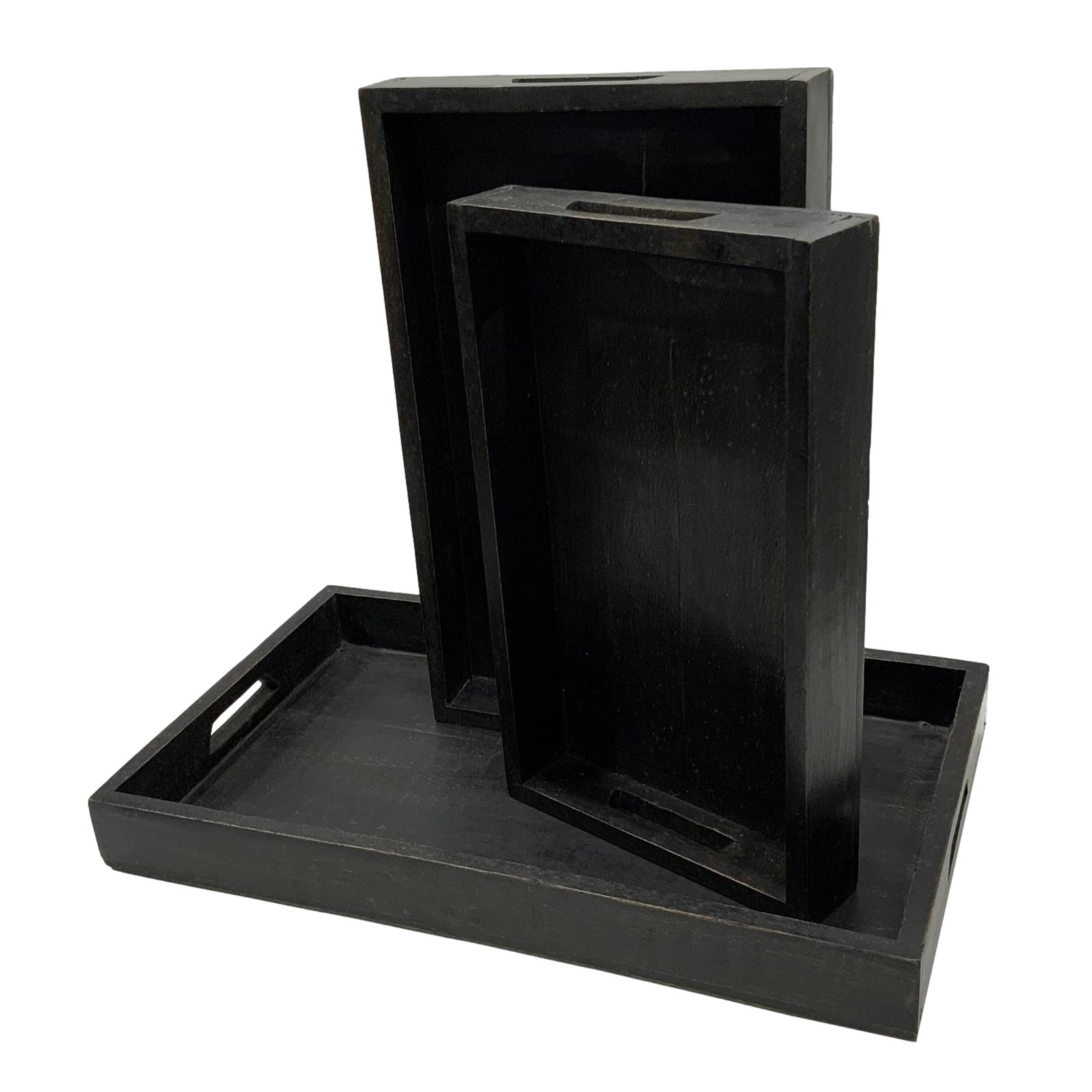 This set of three serving/charcuterie trays is the perfect addition to any home. Crafted from Mango Wood these solid wood trays are food-safe sturdy and designed to last. The large tray measures 20 x 12 x 2 high while the other two trays nest inside for easy storage when not in use.