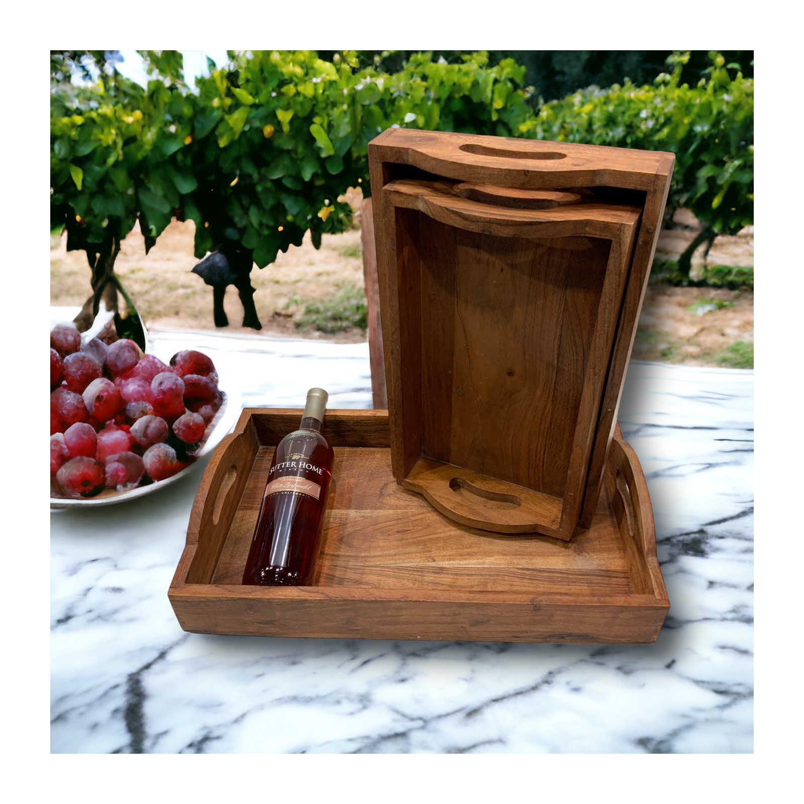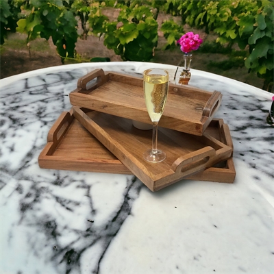 This set of three serving/charcuterie trays is the perfect addition to any home. Crafted from Acacia Wood these solid wood trays are food-safe sturdy and designed to last. The large tray measures 20 x 12 x 2 high while the other two trays nest inside for easy storage when not in use.