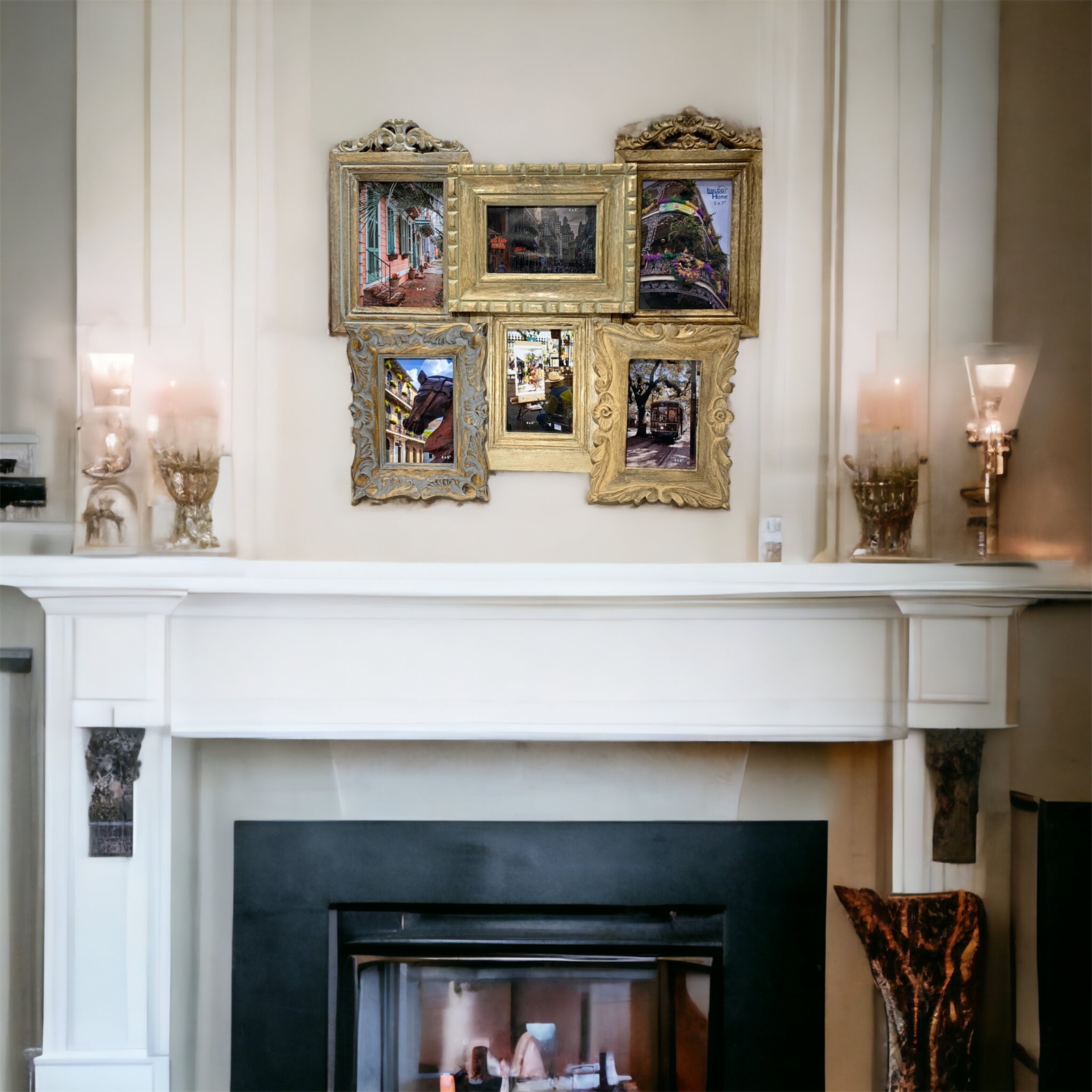 The frame can hold two 5x7 photos and four 4x6 photos making it perfect for showcasing your favorite memories or creating a personalized wall display. Additionally the collage comes with a set of photos that depict the romantic charm of New Orleans which can be used for display or replaced with your own photos.
