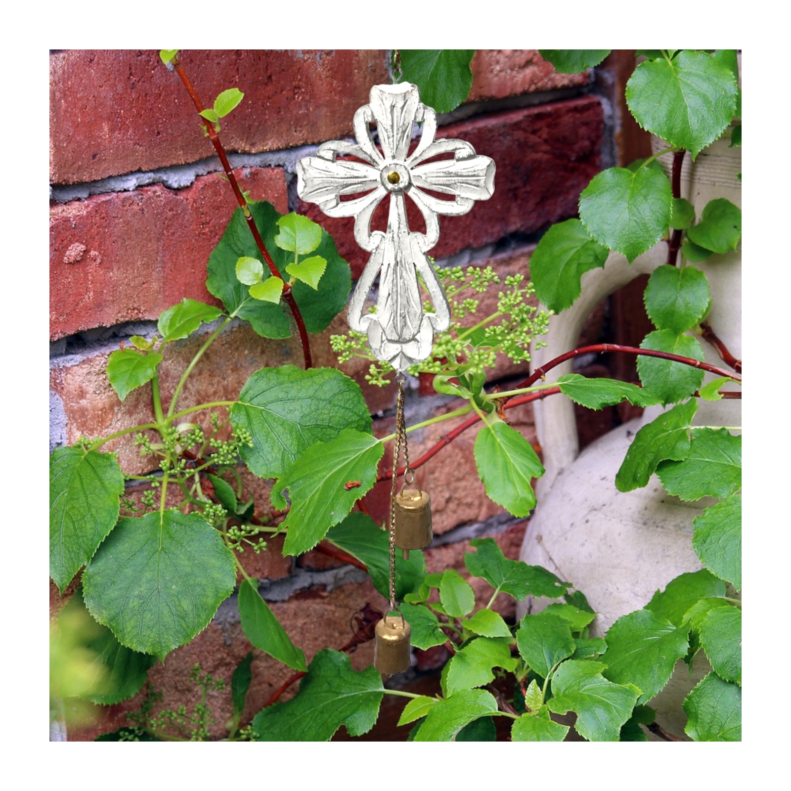 Niccoline Wood Cross Hanging Chapel Bells Wind Chime - a stunning piece of decor that is both elegant and charming. Each wood cross is hand-carved in India with intricate details then hand patina whitewashed making each one unique. The metal bell chimes are also hand-made and have metal clappers producing a beautiful sound with every breeze. This wind chime is versatile and can be hung in various places such as a window sun porch or even out in the garden. With a measurement of 6 wide x 24 long and a metal chain for easy hanging it is a perfect addition to any space that needs a touch of grace and melody. These Chapel Bells bring a sense of serenity to the home and garden.