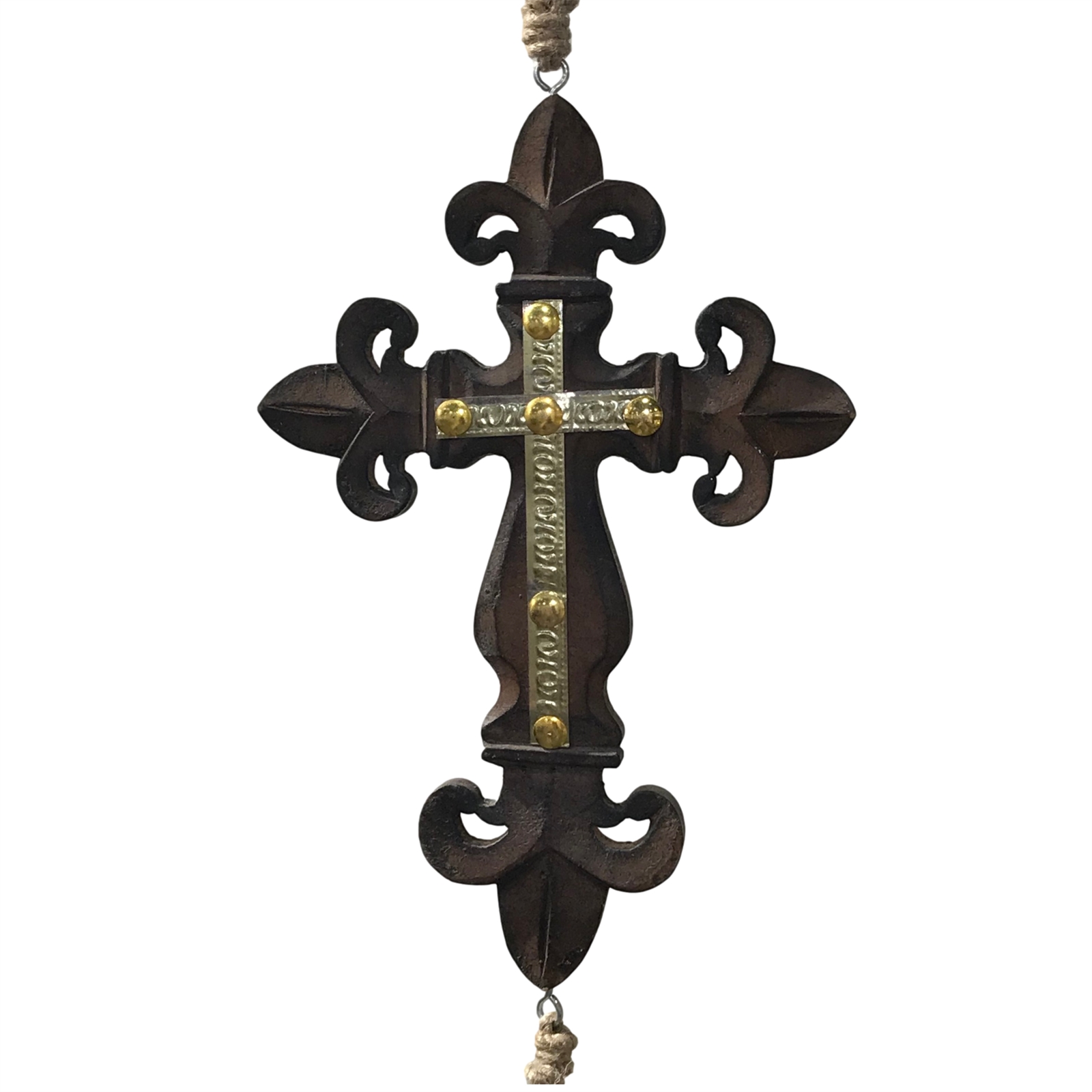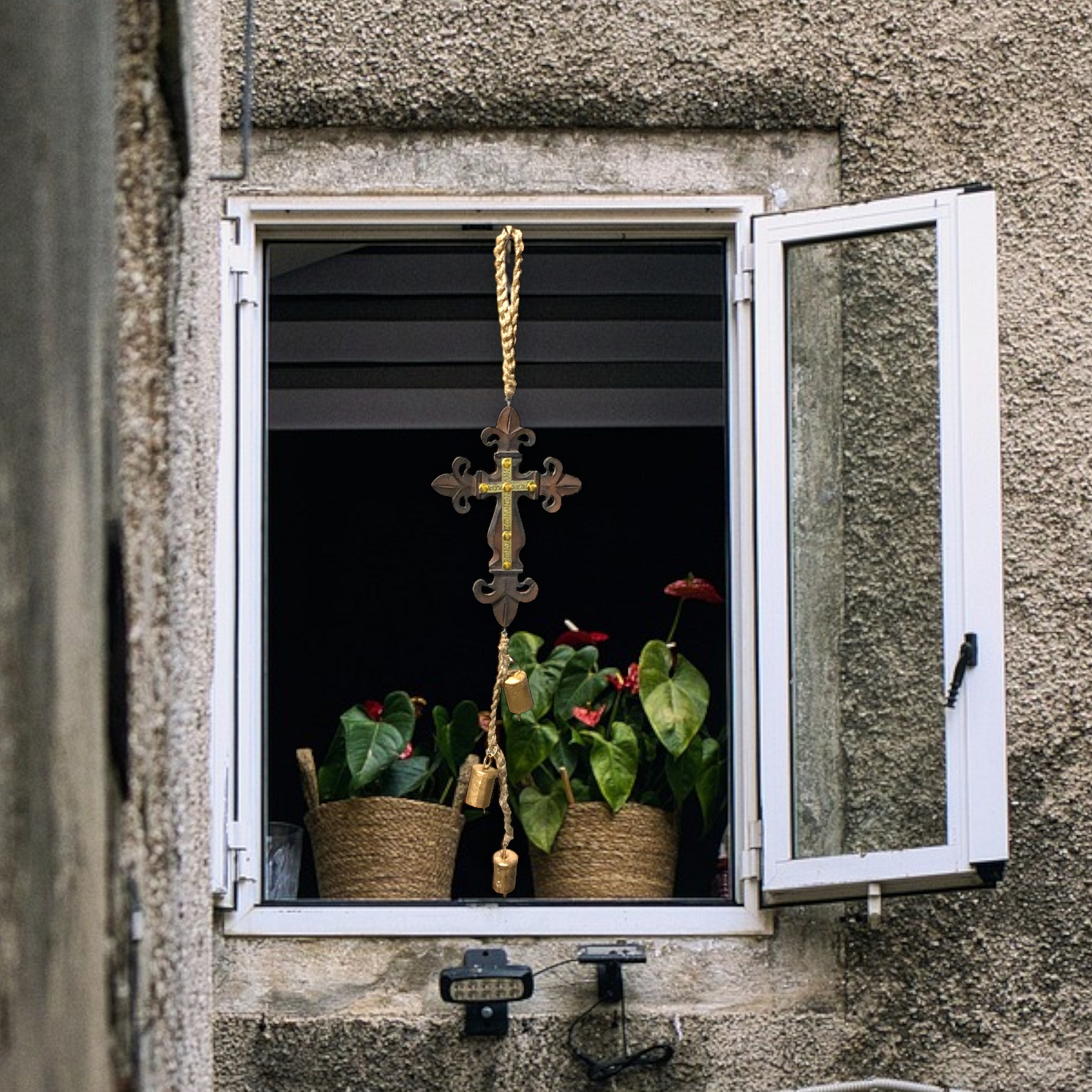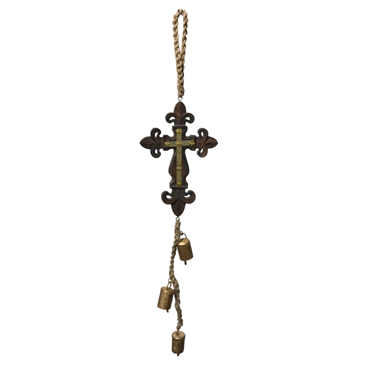St. Joan of Arc Wood Cross Hanging Chapel Bells Wind Chime - a stunning piece of decor that is both elegant and charming. Each wood cross is hand-carved in India with intricate details and adorned with brass studs then hand patina in a distressed brown finish making each one unique. The metal bell chimes are also hand-made and have metal clappers producing a beautiful sound with every breeze. This wind chime is versatile and can be hung in various places such as a window sun porch or even out in the garden. With a measurement of 6 wide x 28 long and a sturdy jute hanger for ease of installing it is a perfect addition to any space that needs a touch of grace and melody. These Chapel Bells bring a sense of serenity to the home and garden.