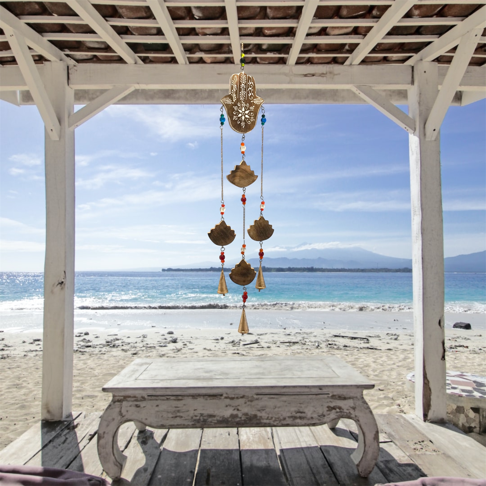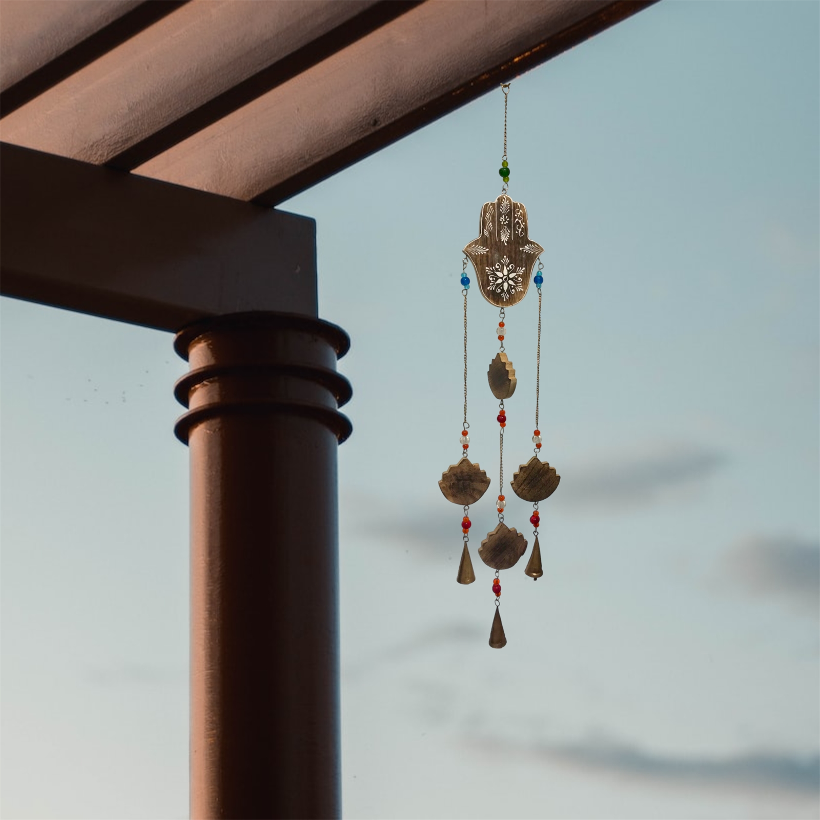 Wood Fatima Hand Bell Wind Chime a captivating blend of artistry and serenity. The centerpiece of this wind chime is the carved Mango Wood Fatima Hand a symbol of protection and blessings. The hand is detailed on both sides with henna designs.