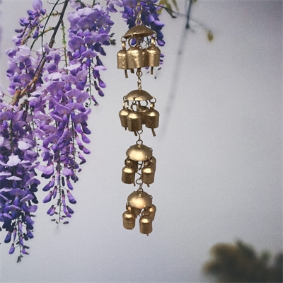 The wind chime features three burnished gold metal bell chimes with metal clappers within the bells that produce a delicate and soothing tone evoking a sense of calm and harmony in your surroundings.