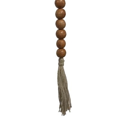 Enhance the ambiance of your living space with our exquisite Wooden Bead Garland. Measuring 84 in length this versatile decor piece features natural jute tassels that lend an organic charm. The finish is called Toast a hand-applied stain that looks similar to a light pecan and sealed with a soft satin sheen. Each garland is unique due to the hand finishing on the beads.