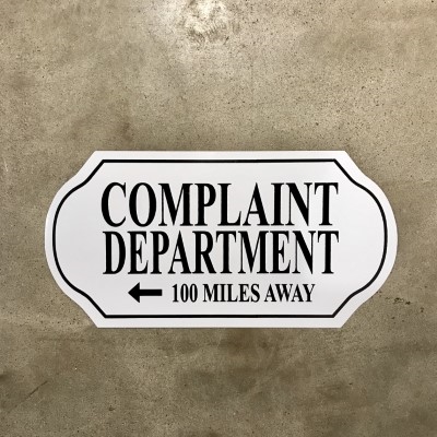 Complaint Department Sign 9 Orders Your Price: $ 0 EA Suggested Retail: $12.34 Item # 64020 Availability Available for Immediate Delivery Category Garden Dimensions 19x0.25x9.5h Add to Cart Save