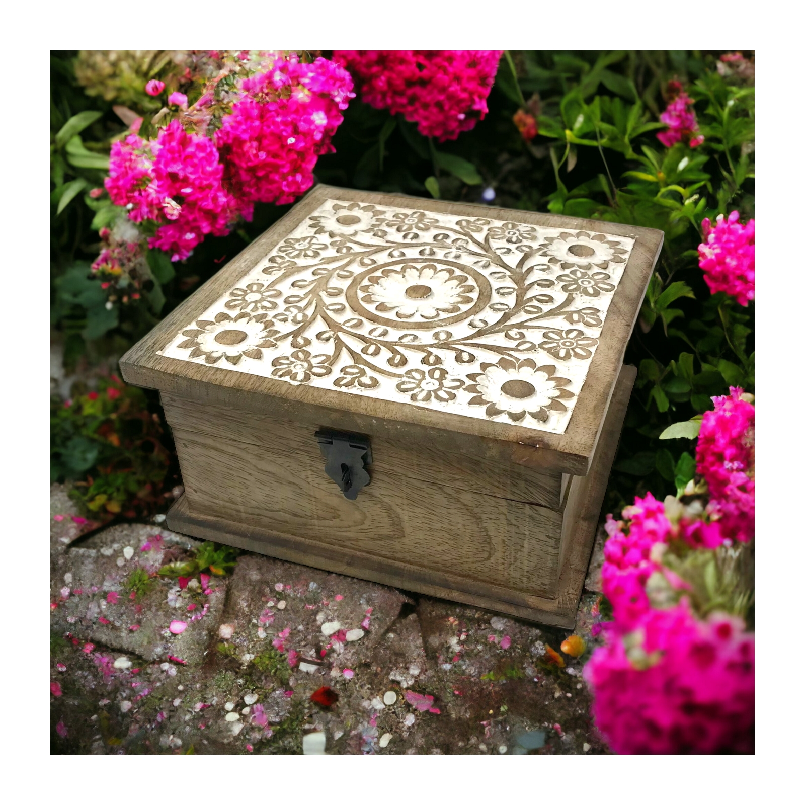 We are excited to introduce our Hand-Carved Wood Flower Garden Hinged Square Table Box made in India. This beautiful box is a perfect addition to any home decor and is sure to add a touch of elegance and sophistication to your inventory.