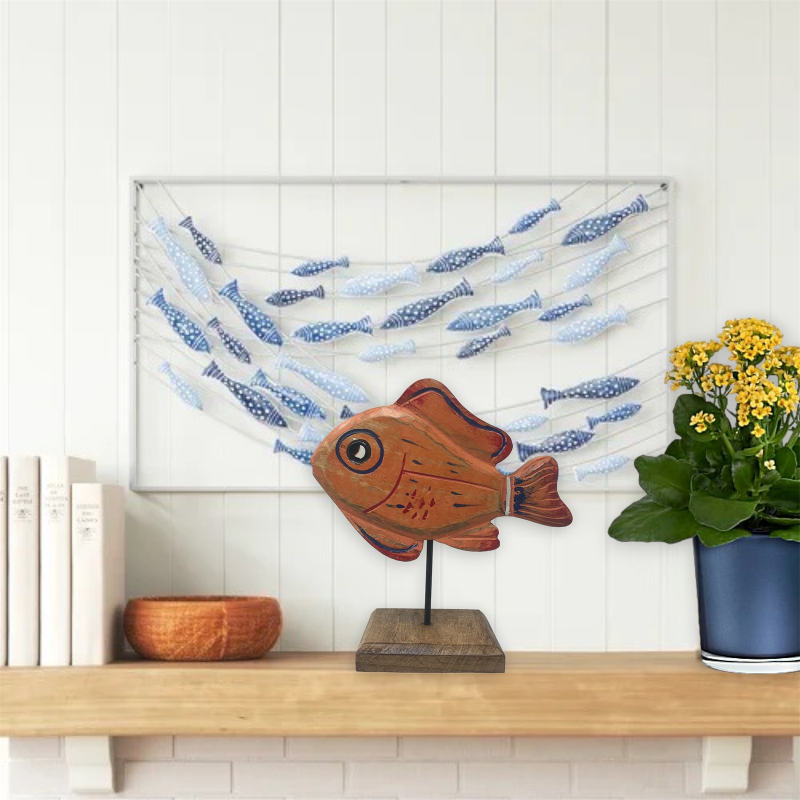 Gordy is a mesmerizing Mango Wood Hand-Carved Gold Fish sculpture expertly crafted in India. This exquisite artwork showcases the skill and creativity of artisans meticulously carved from luxurious mango wood. Gordy elegantly rests on a solid mango wood base firmly attached with a metal rod ensuring stability and durability. The base features rubber no-slip cushion pads providing a secure grip and safeguarding surfaces. With dimensions of 9.5x5x10 high Gordy commands attention while seamlessly fitting into any space. The hand-painted colors of red and blue expertly applied on top of an orange distressed base infuse Gordy with a worn vintage charm that adds character and nostalgia to its aesthetic. The sculpture is intricately carved on all sides allowing for a captivating view from every angle. Gordy the Mango Wood Hand-Carved Gold Fish is a captivating piece that will enhance any living space bringing a touch of artistry elegance and a hint of nostalgia to your home.