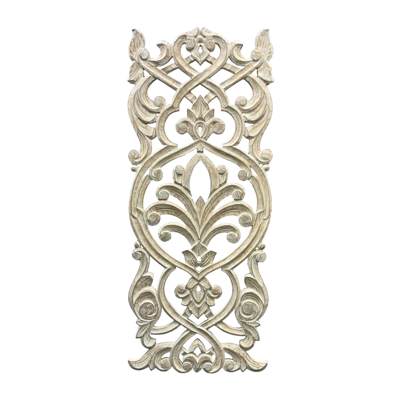 The Princess Wall Grill has been hand-finished with a whitewash patina giving it a vintage and rustic look. The patina adds depth and texture to the piece making it even more visually appealing. The dimensions of the wall grill are 15 inches in length 0.75 inches in width and 35.5 inches in height making it the perfect size for hanging on any wall.