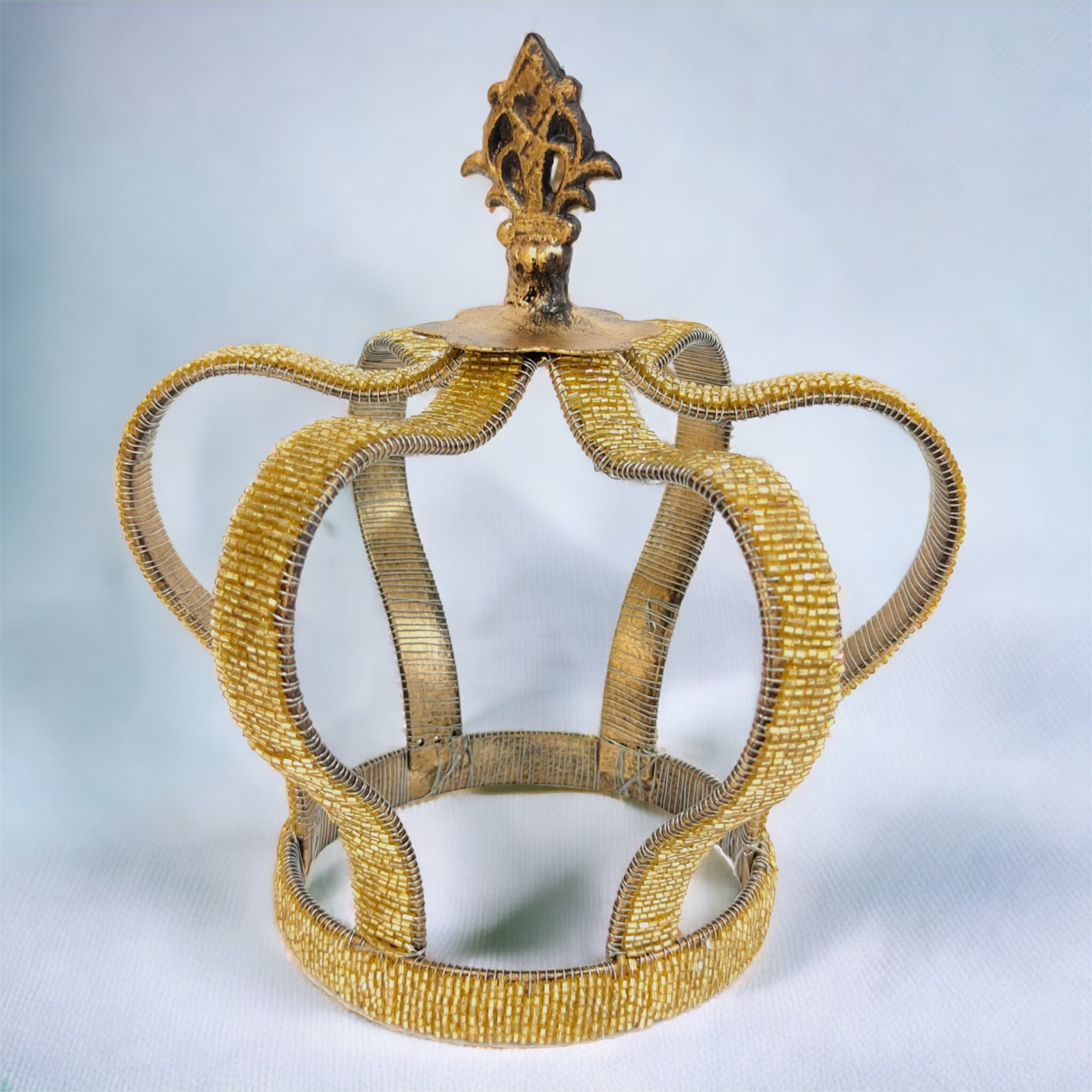 To add a touch of grandeur each Crown is beautifully topped with a cast Iron Finial further enhancing its majestic appearance. This unique combination of delicate beadwork and sturdy iron craftsmanship makes the Sovereign Crown a timeless and remarkable decorative piece.